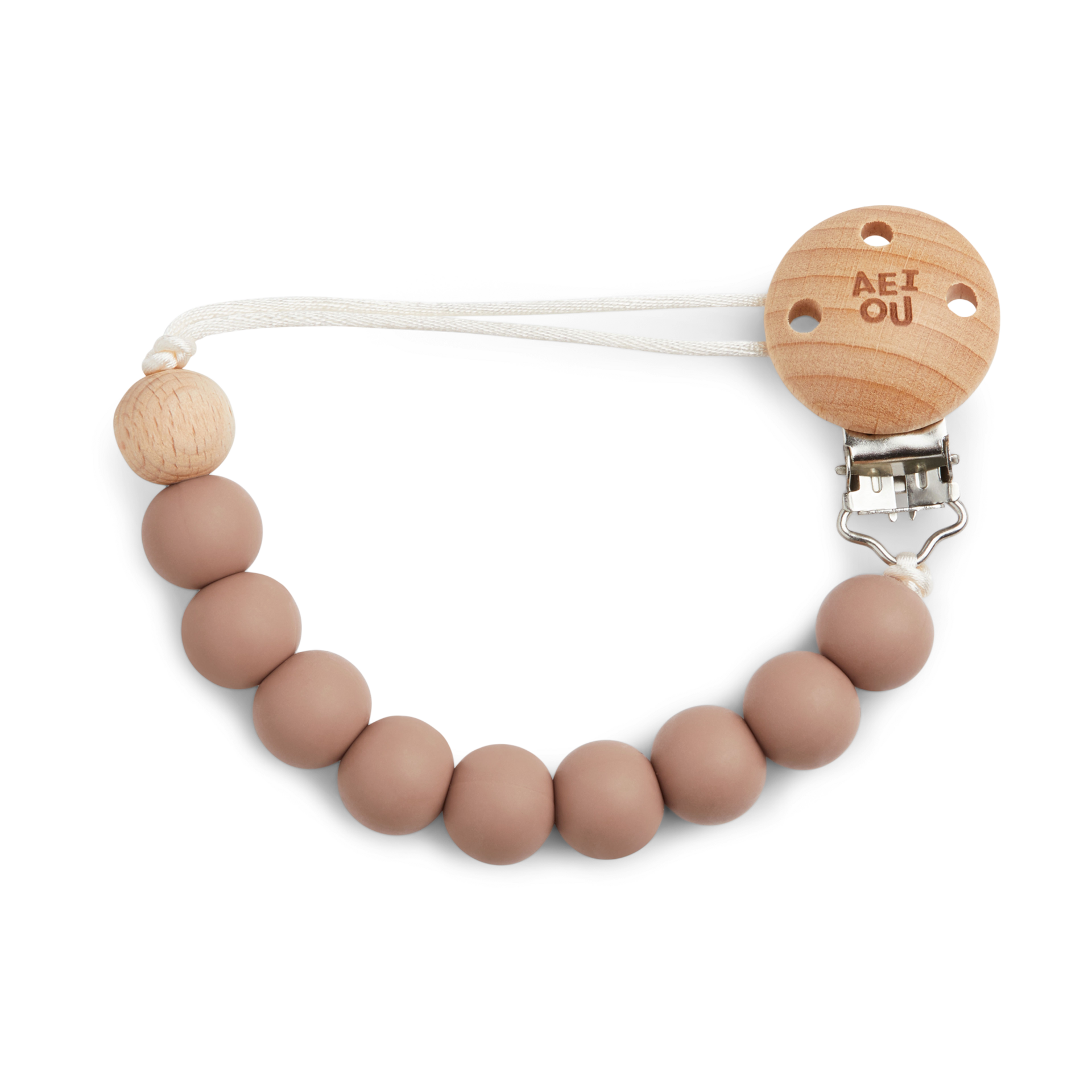 Made from food-grade silicone beads with a nylon string, this Silicone Pacifier Clip from AEIOU keeps baby’s pacifier, teether or small toy within easy reach—and off the ground. Parents find pacifier clips are one of those lesser-known must-haves that make everyday life easier. For a coordinated look, pair it with the AEIOU Silicone & Wood Multi-Ring Teether (sold separately).