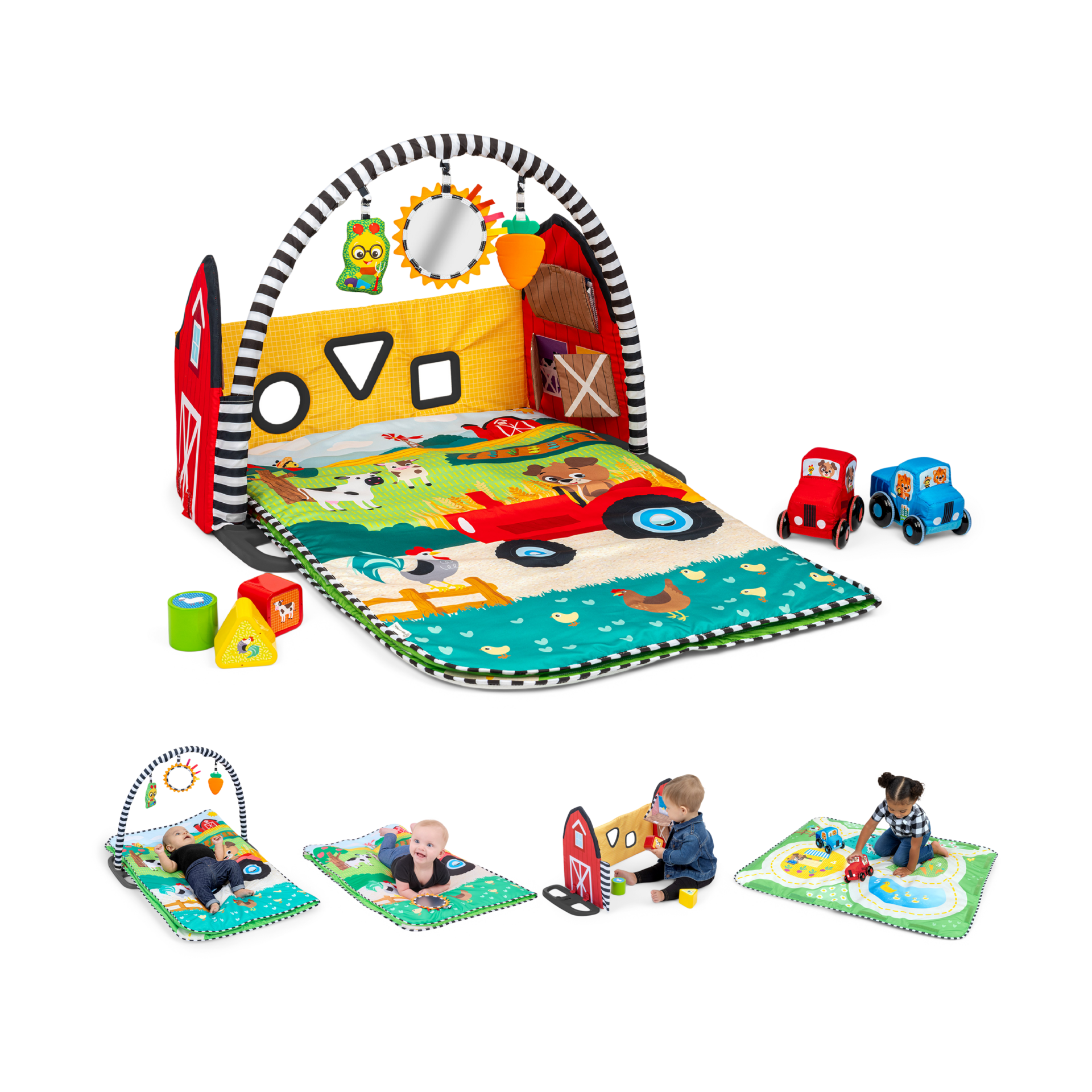 My son absolutely loves this barnyard mat. He likes driving the trucks the most. Mat washes well and air dry no pilling. Keeps him entertained. The Baby Einstein Farm Explorers Busy Barnyard Gym grows with baby from 0-48+ months. Features 3 dangling toys, plush mat for tummy time, musical vehicles, 3D barn with shape sorter, and road mat for toddler play. Requires 4 Aa batteries not included.