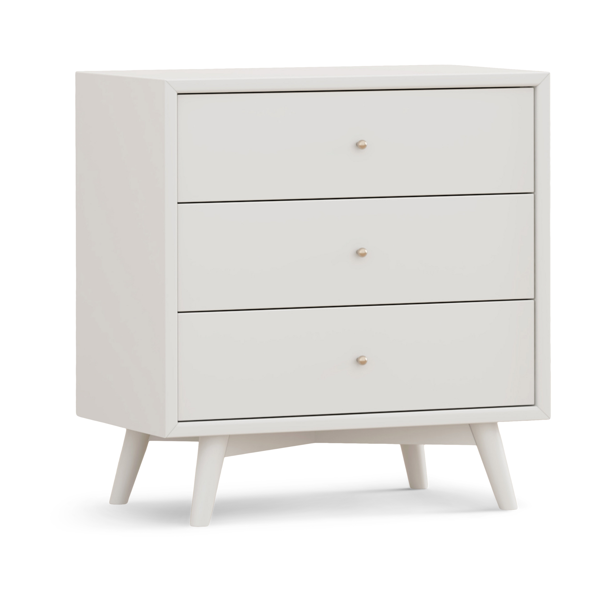 The Palma 3-Drawer Dresser is a sophisticated mid-century inspired design with tapered legs, brushed metal hardware and smooth-glide drawers.