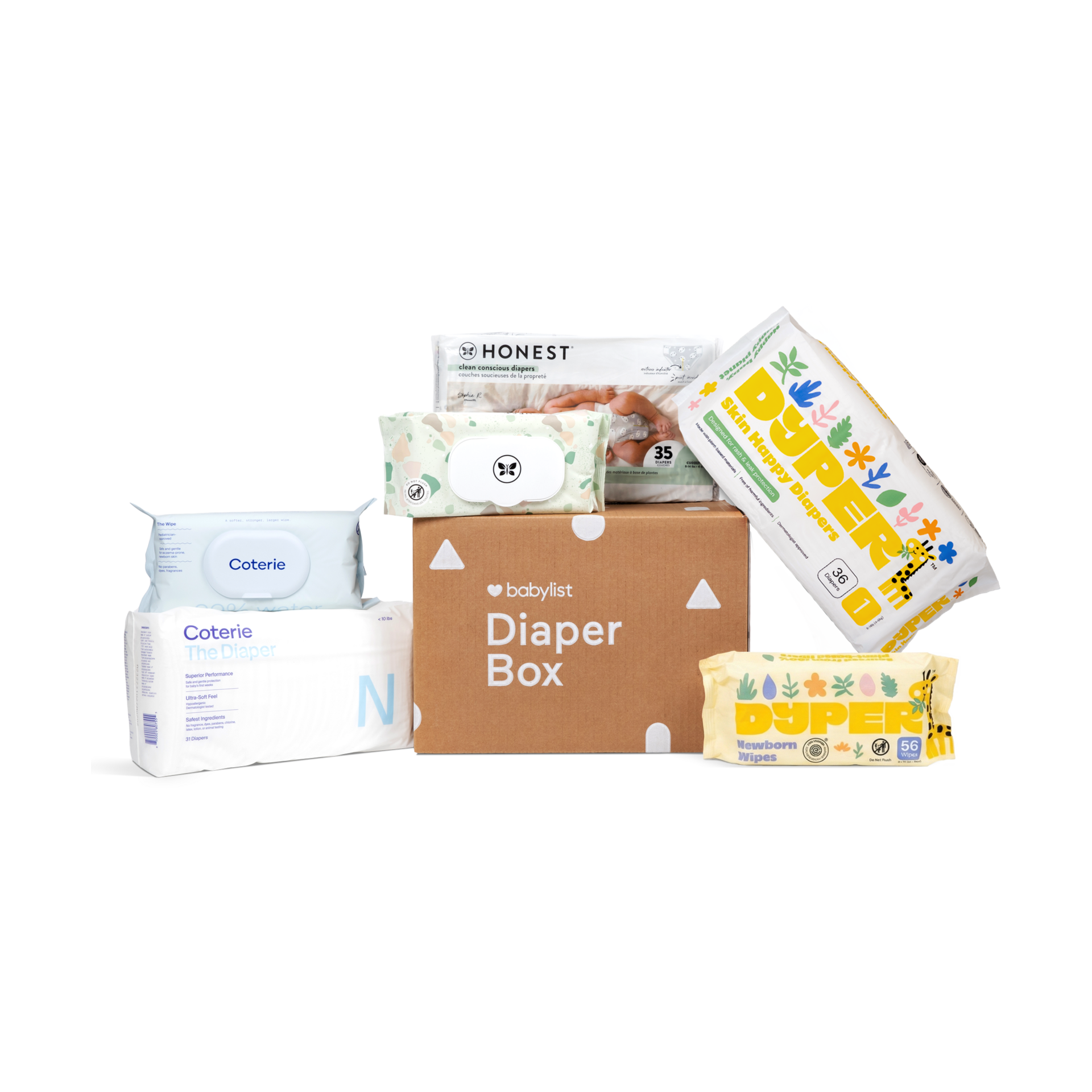 - Includes diapers and wipes from The Honest Company, DYPER and Coterie