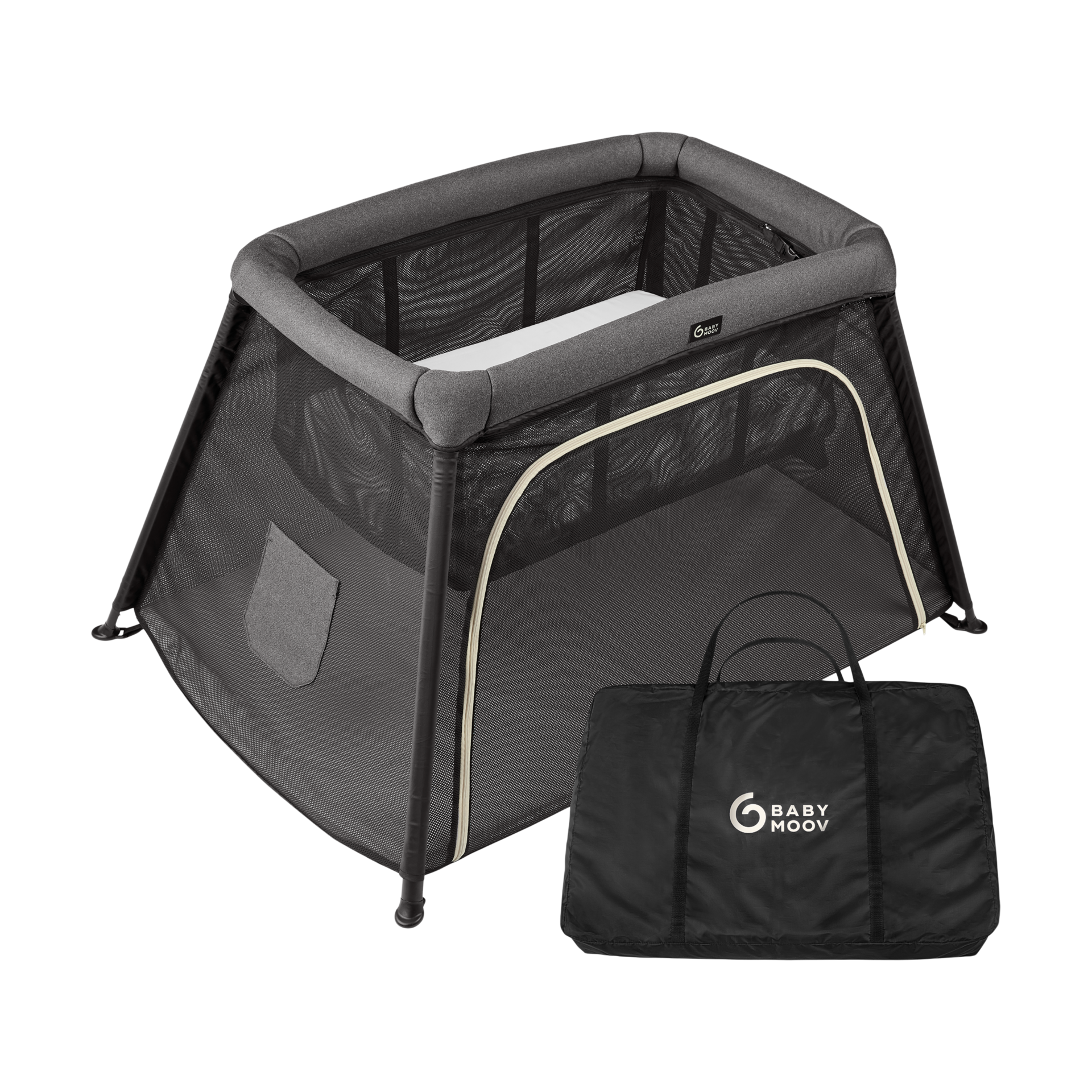 The Moov Travel Bed, Playard and Bassinet offers three stages: a travel crib (for babies up to six months), a travel bed and a secure play area.