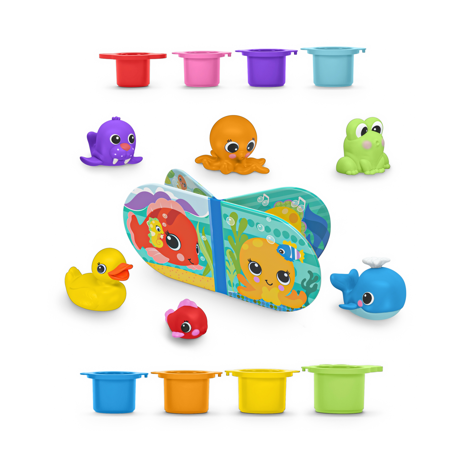 This bath set includes 15 pieces that engage little ones and support development. It comes with a classic rubber ducky, frog, fish, walrus, whale, octopus, waterproof book and eight rainbow stacking cups.