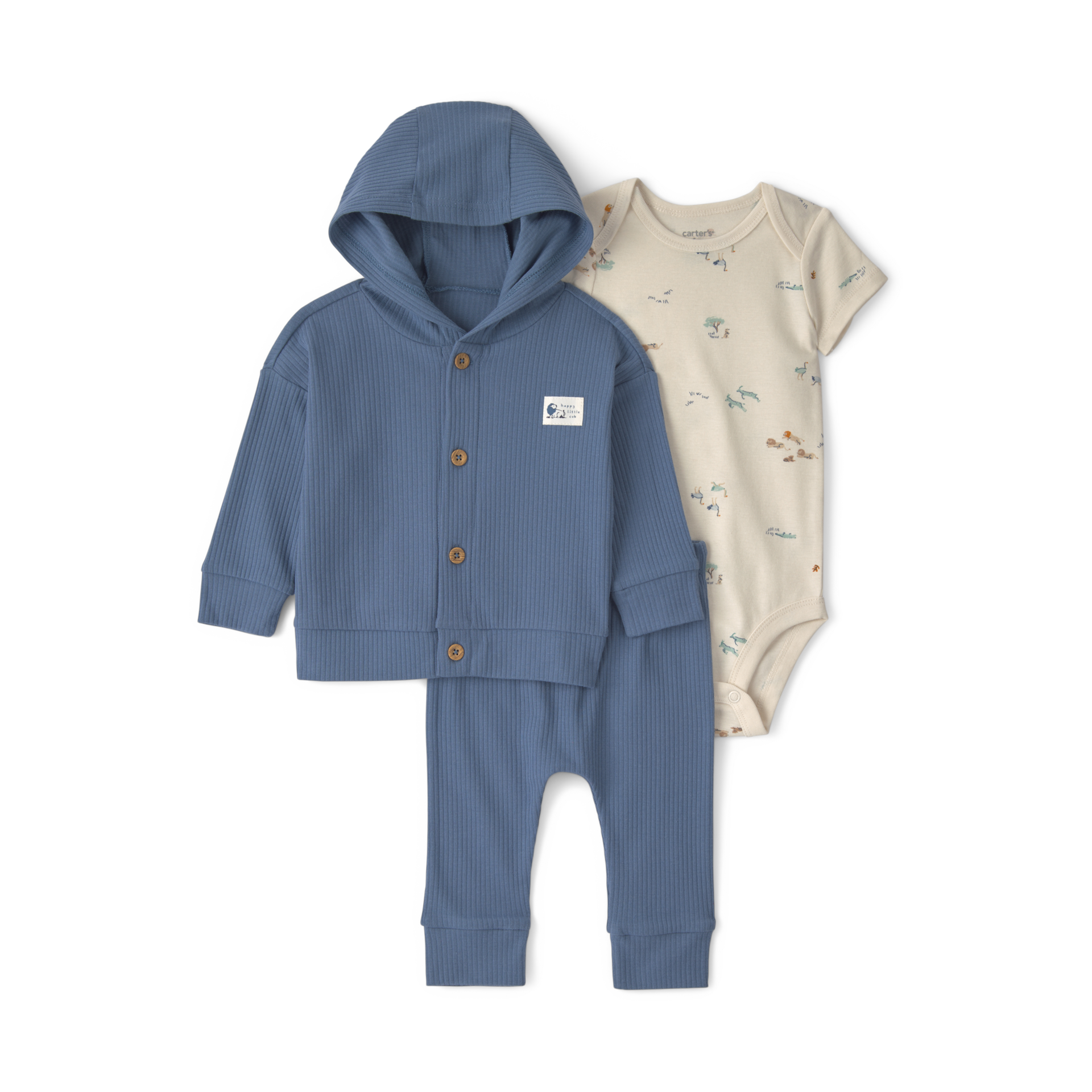 Crafted in soft cotton, this adorable three-piece set comes with a button-front cardigan, short-sleeve bodysuit and a pair of coordinating pants. It keeps your little one comfy and cozy in style.