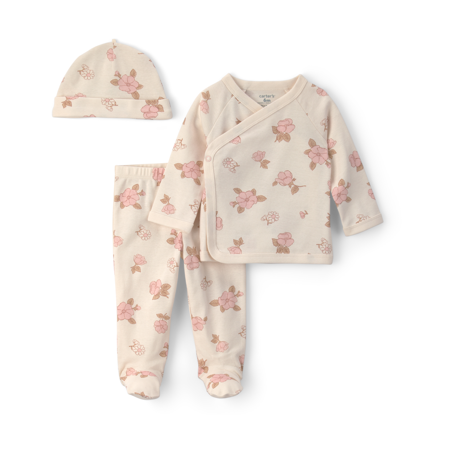 - 3-piece set includes kimono-style top, pants and hat