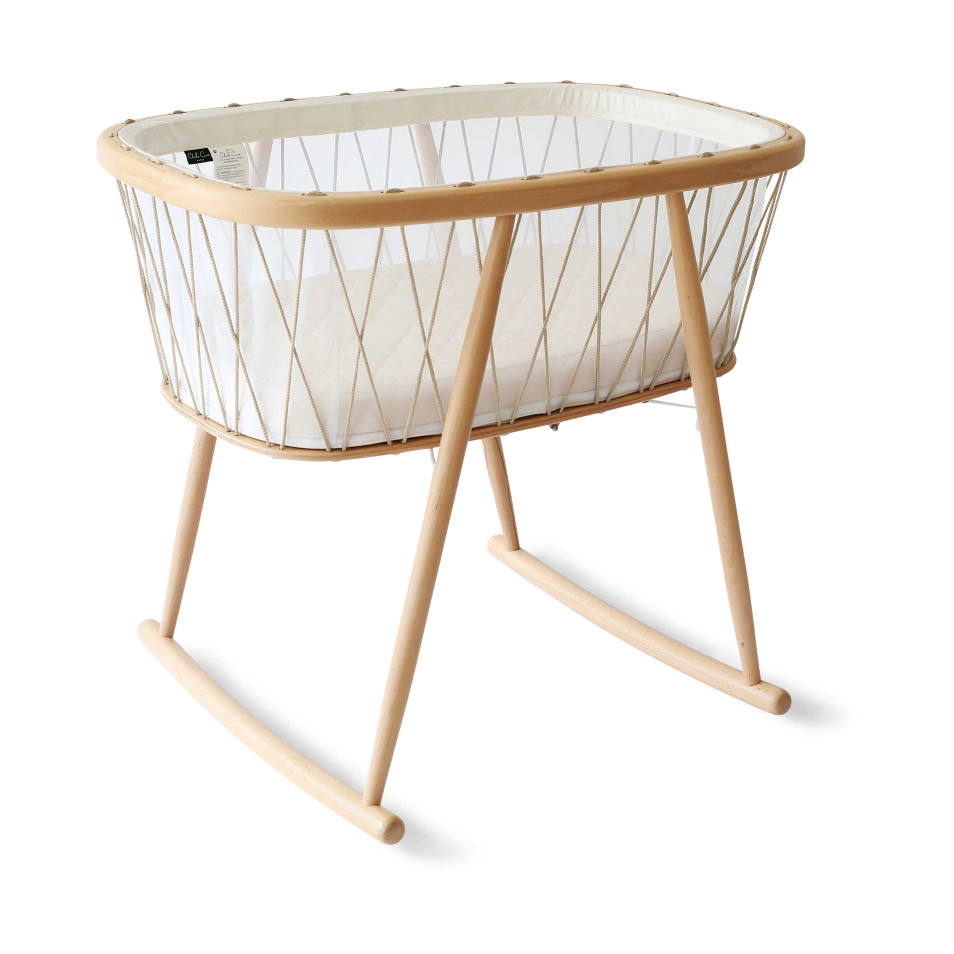 Charlie Crane designed the KUMI as both a reassuring cocoon and a space open to the world beyond. It offers a delicate movement (a lateral swing) that helps babies fall asleep, while the laces give the design both lightness and safety.