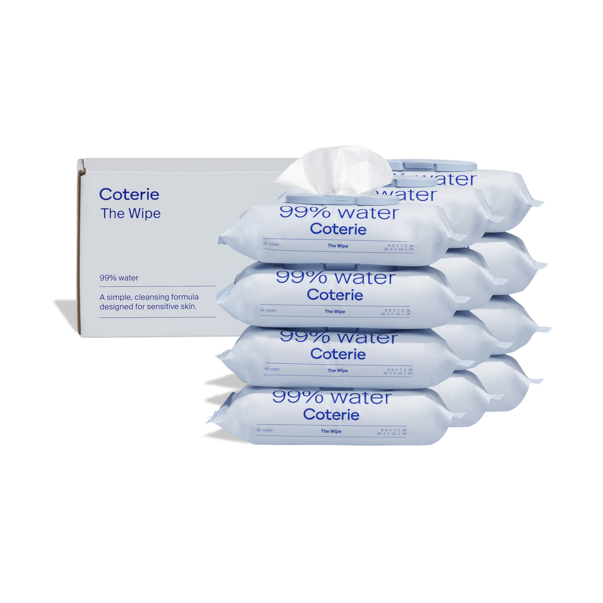 Coterie Wipes use a 99% purified water solution plus five clean ingredients on 100% plant-derived, plastic-free fibers. The wipes are strong, soft and larger than average for a more thorough clean.