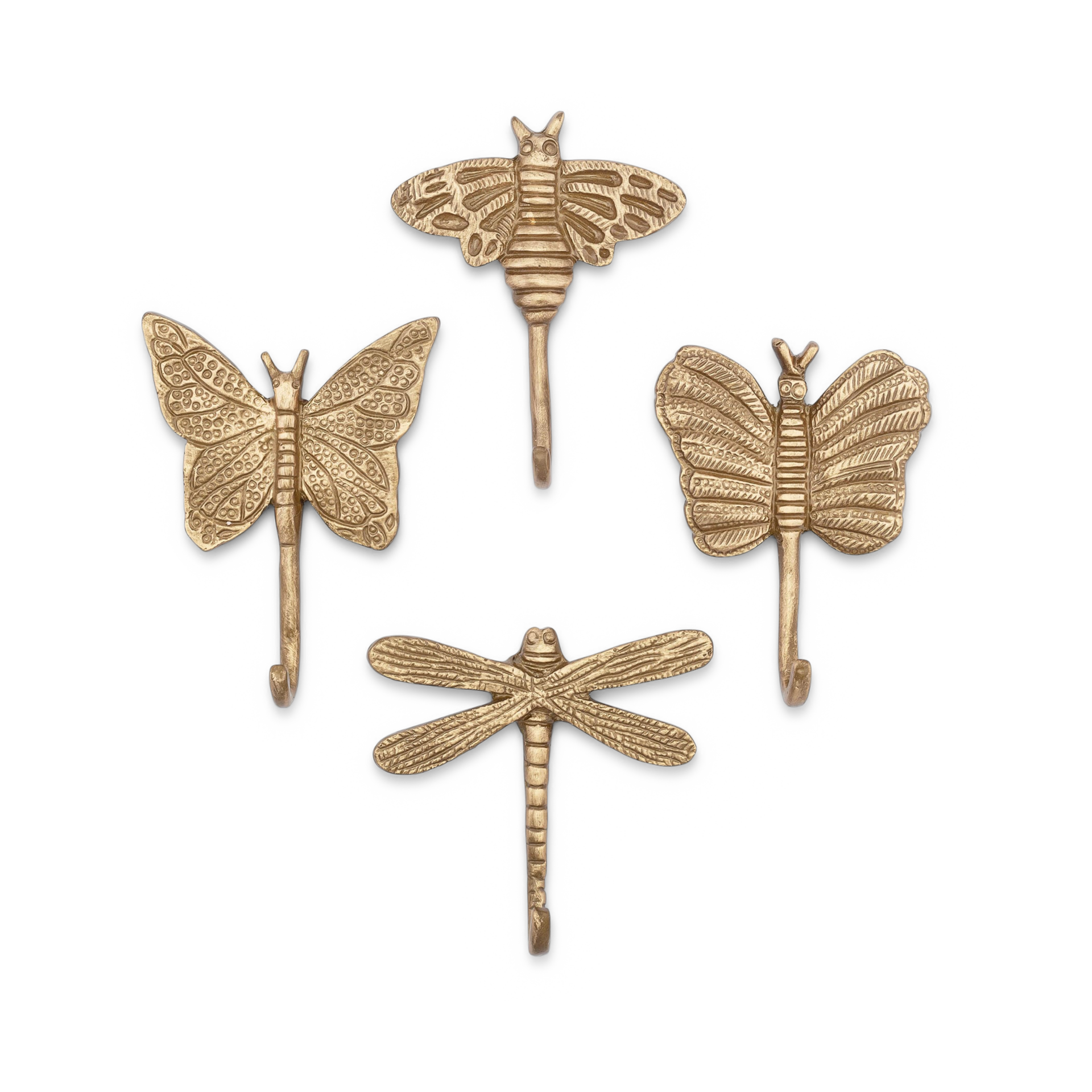 This set of decorative antique gold wall hooks is shaped like bees and dragonflies for charming nursery organization.