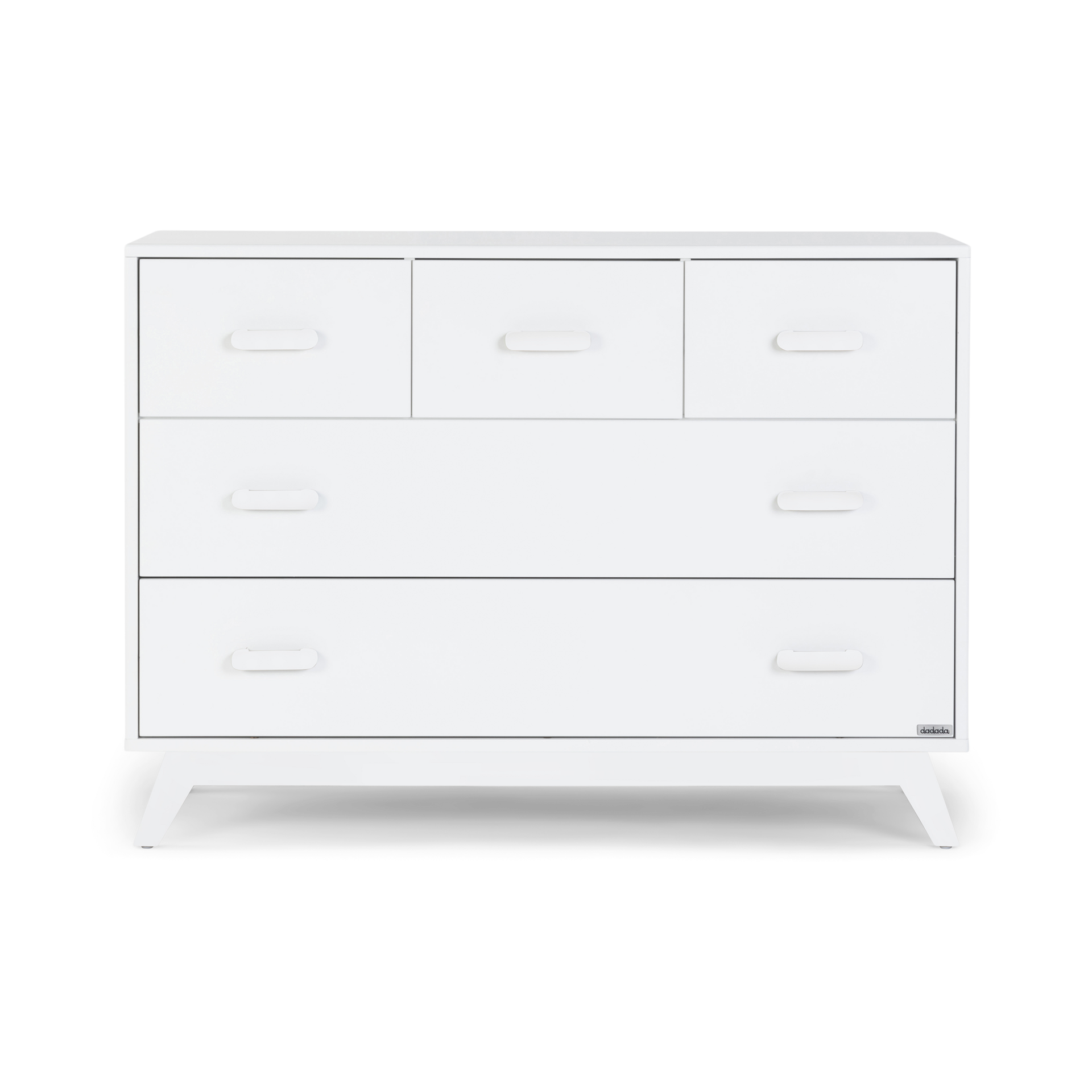 Stable and strong, the Soho 5-Drawer Dresser features sturdy angled legs and solid wood handles plus forged steel support and a baby-safe painted finish. The removable changing tray (sold separately) fits snugly on top for the diaper years. Extra deep soft-close drawers also provide ample storage.