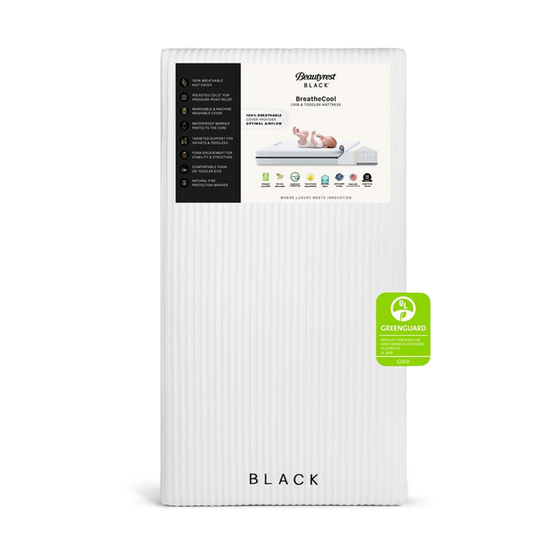 The Beautyrest Black BreatheCool Mattress features a 100% breathable knit cover for optimal airflow. This helps regulate baby’s temperature as they sleep.