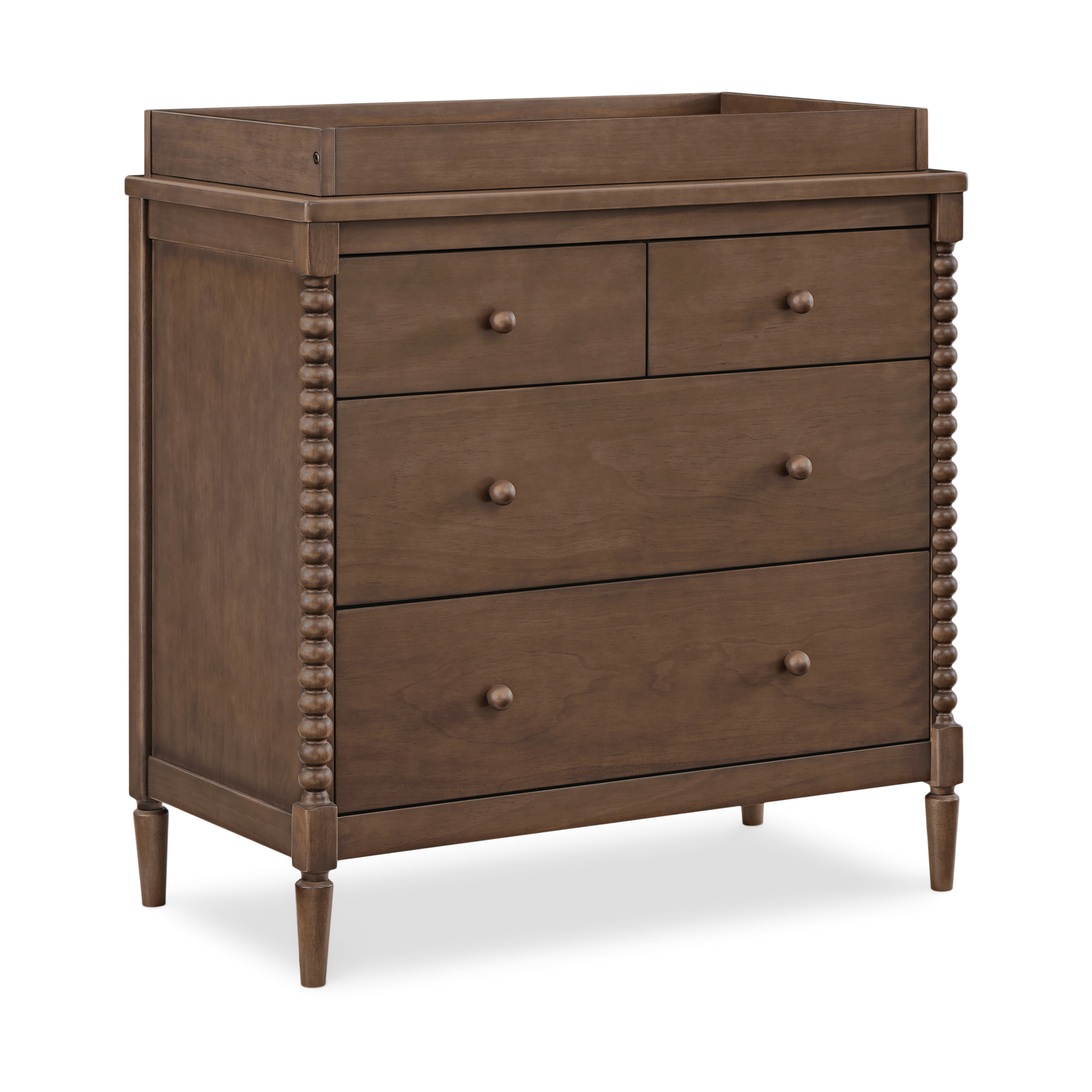 A modern take on a vintage-inspired dresser, the Saint 4 Drawer Dresser with Changing Top by Delta Children is adorned with solid wood turned posts.