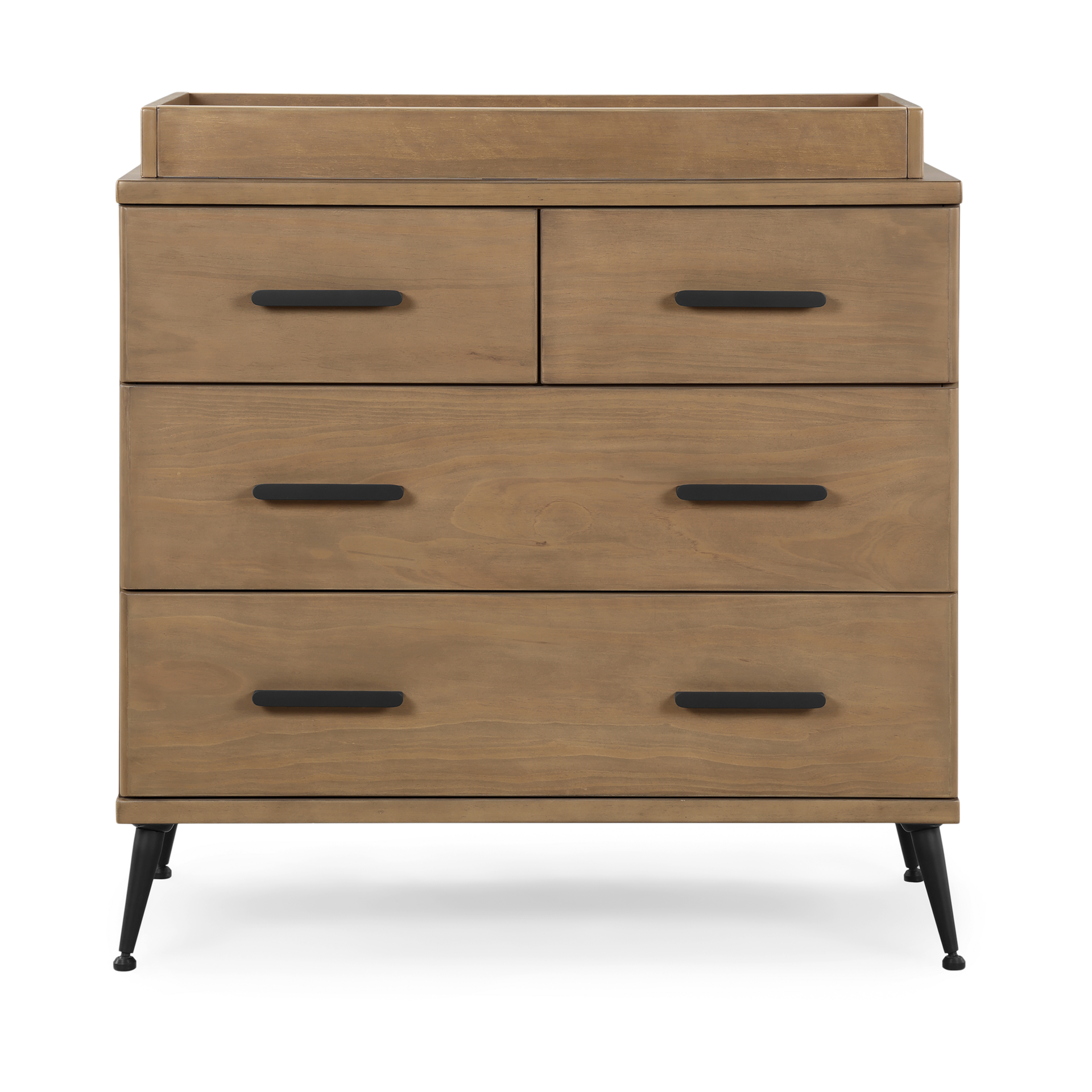 Sleek and modern, this dresser boasts a mixed material design with bronze splayed feet and drawer handles. It features four spacious drawers and includes a removable changing top for diaper changes. When the diaper days are over, simply remove the changing top. For safety, this dresser is equipped with an interlocking drawer system that limits the number of drawers that can be opened at one time.