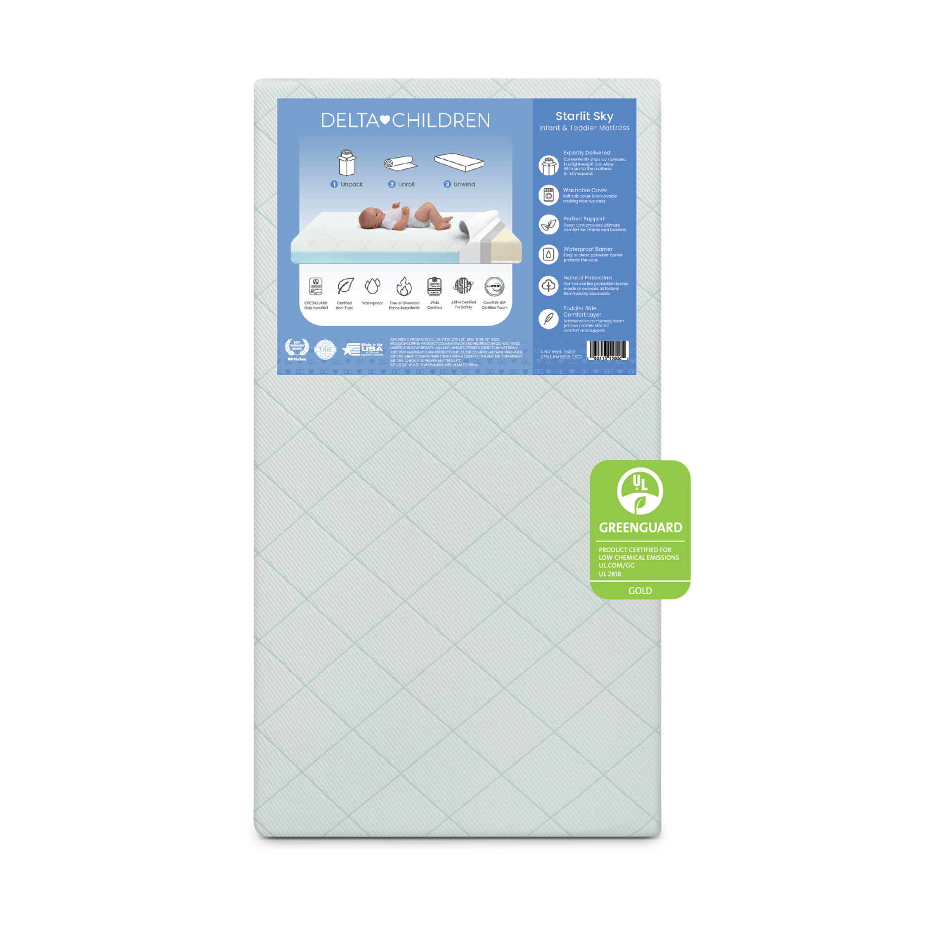 - This 2-sided mattress features a firm infant side and additional comfort layer on the toddler side to accommodate baby’s sleep needs as they grow