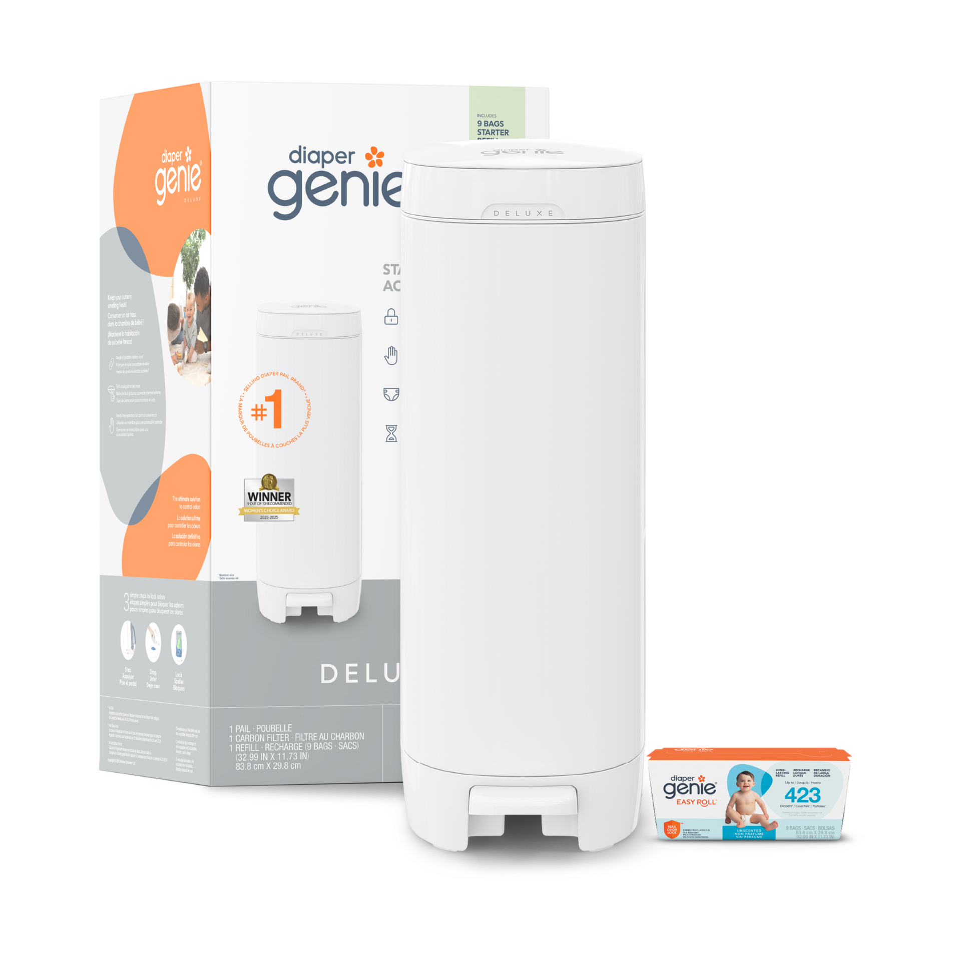 - The included Easy Roll starter refill with 9 bags can hold up to 423 newborn-sized diapers; features perforated bags on a roll for easy disposal