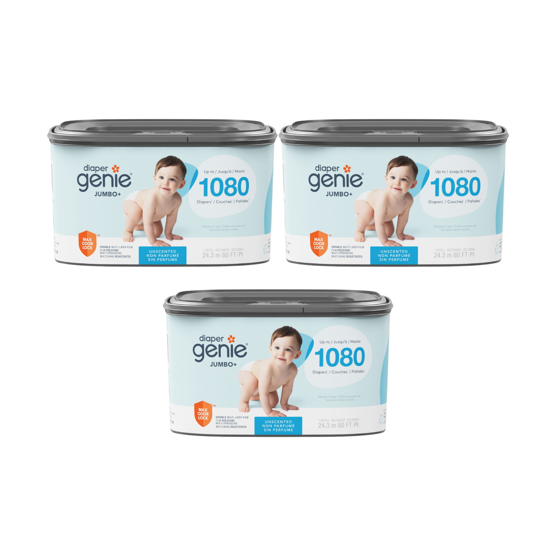 The Diaper Genie Jumbo+ Square Refill offers 80-ft of refill bags that can hold up to 1080 newborn-sized diapers, reducing the frequency of refill purchases and changes.