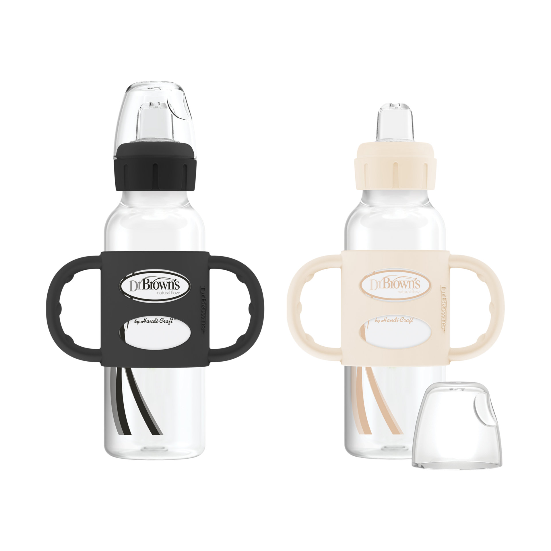 These Sippy Bottles with silicone handles make an ideal first step for baby’s transition from bottle to cup. The soft silicone sippy spout is used in place of the nipple on the Dr. Brown’s bottle that’s already familiar to baby (the sippy spout fits any Dr. Brown’s Options+ Narrow bottle after the internal vent is removed).