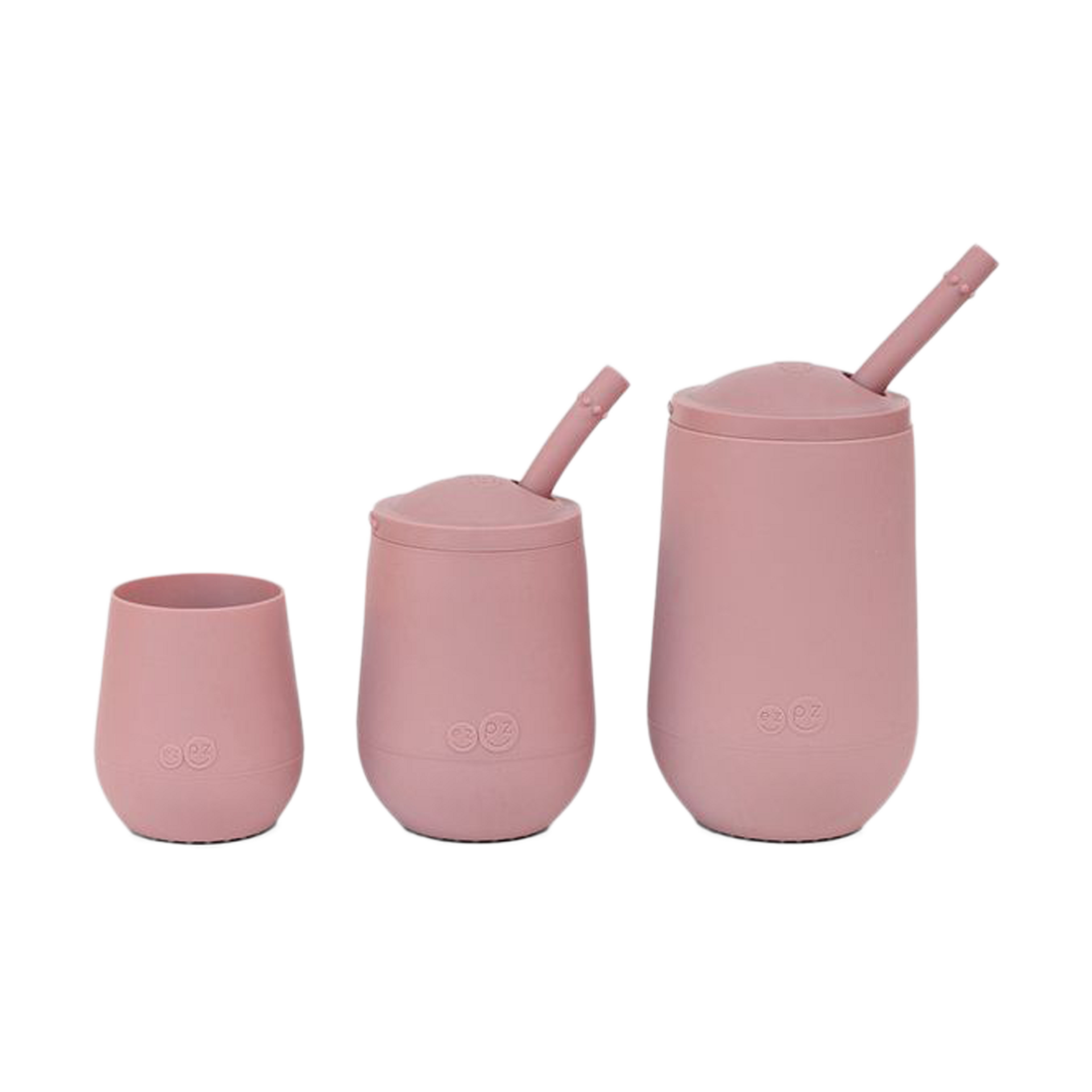 The developmental drinking system starts with the 2oz Tiny Cup (4 months +), followed by the 4oz Mini Cup + Straw (9 months +) and concludes with the 8oz Happy Cup + Straw (2 years +).