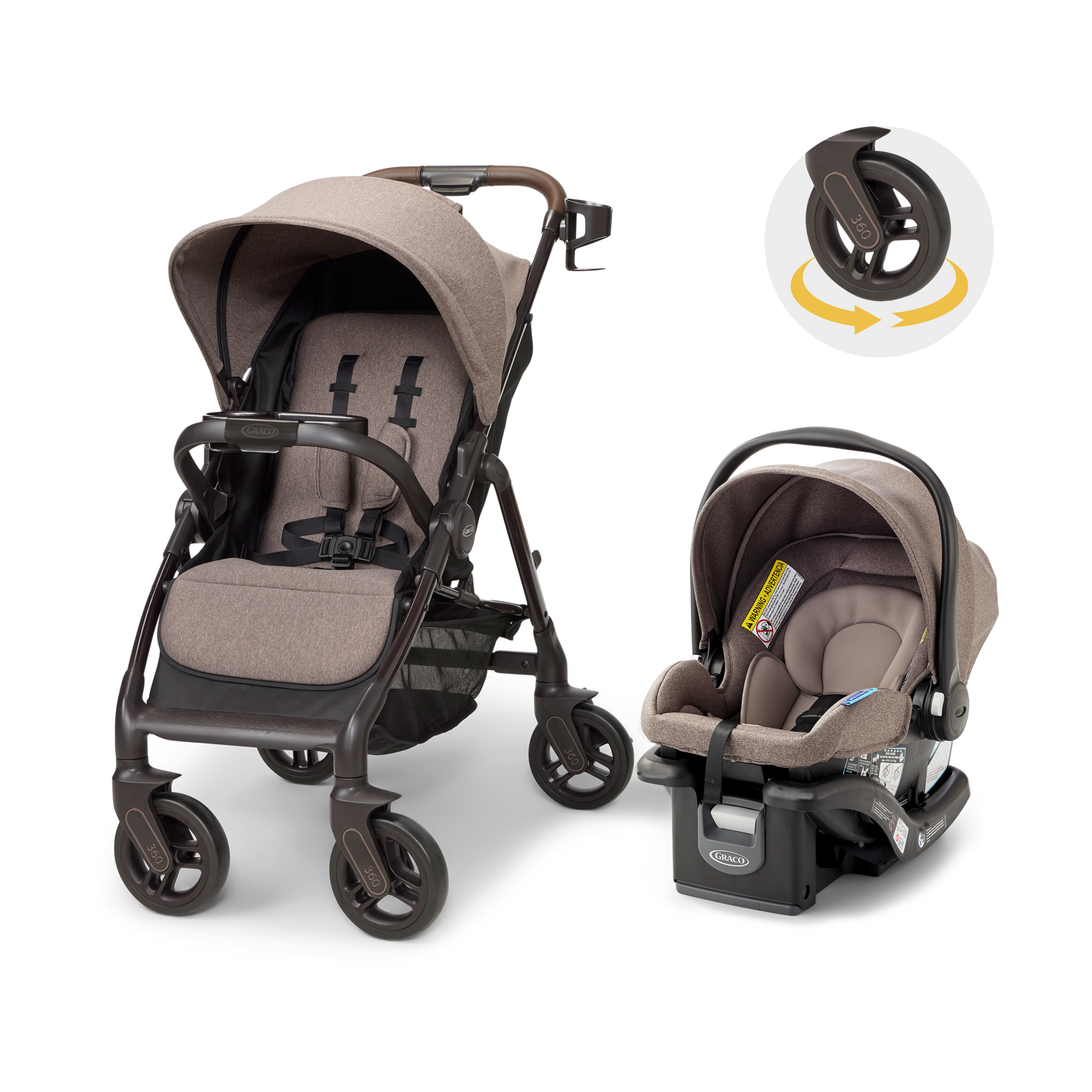 With the push of a button, all four wheels on the Graco Merge Stroller rotate 360° to glide smoothly in any direction, making tight corners, crowded spaces and tricky turns feel seamless.