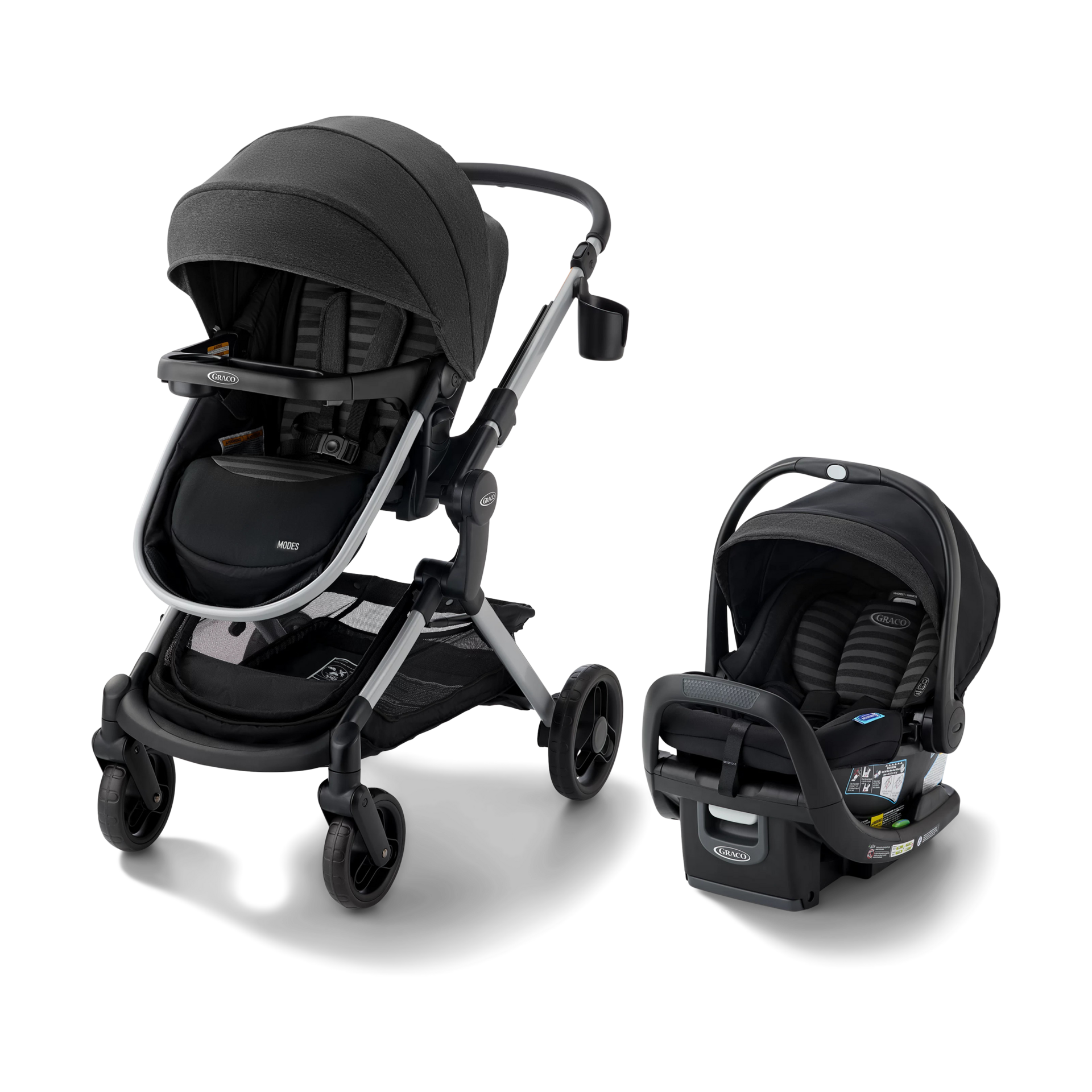 Modes Nest DLX Travel System includes the SnugRide SnugFit LX Infant Car Seat, rear-facing from 4-30 lbs. The stroller seat also converts to infant pramette mode, giving you another option for strolling with newborns.