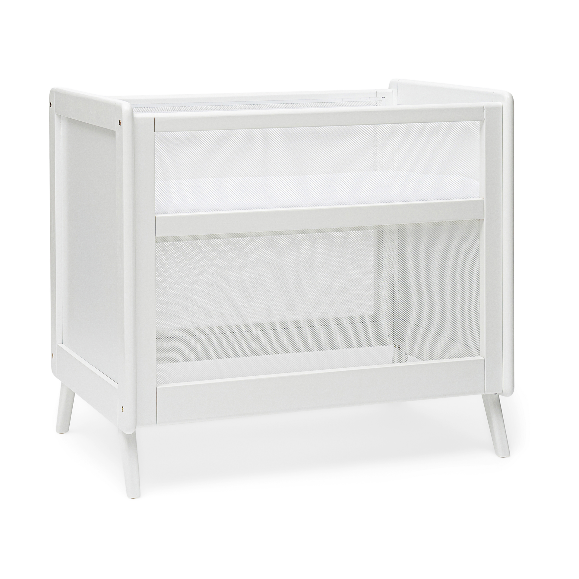 The mini crib features mesh sides for visibility and breathability. It starts off at bassinet height and when they’re ready, you can lower the mattress to crib height for extended use.