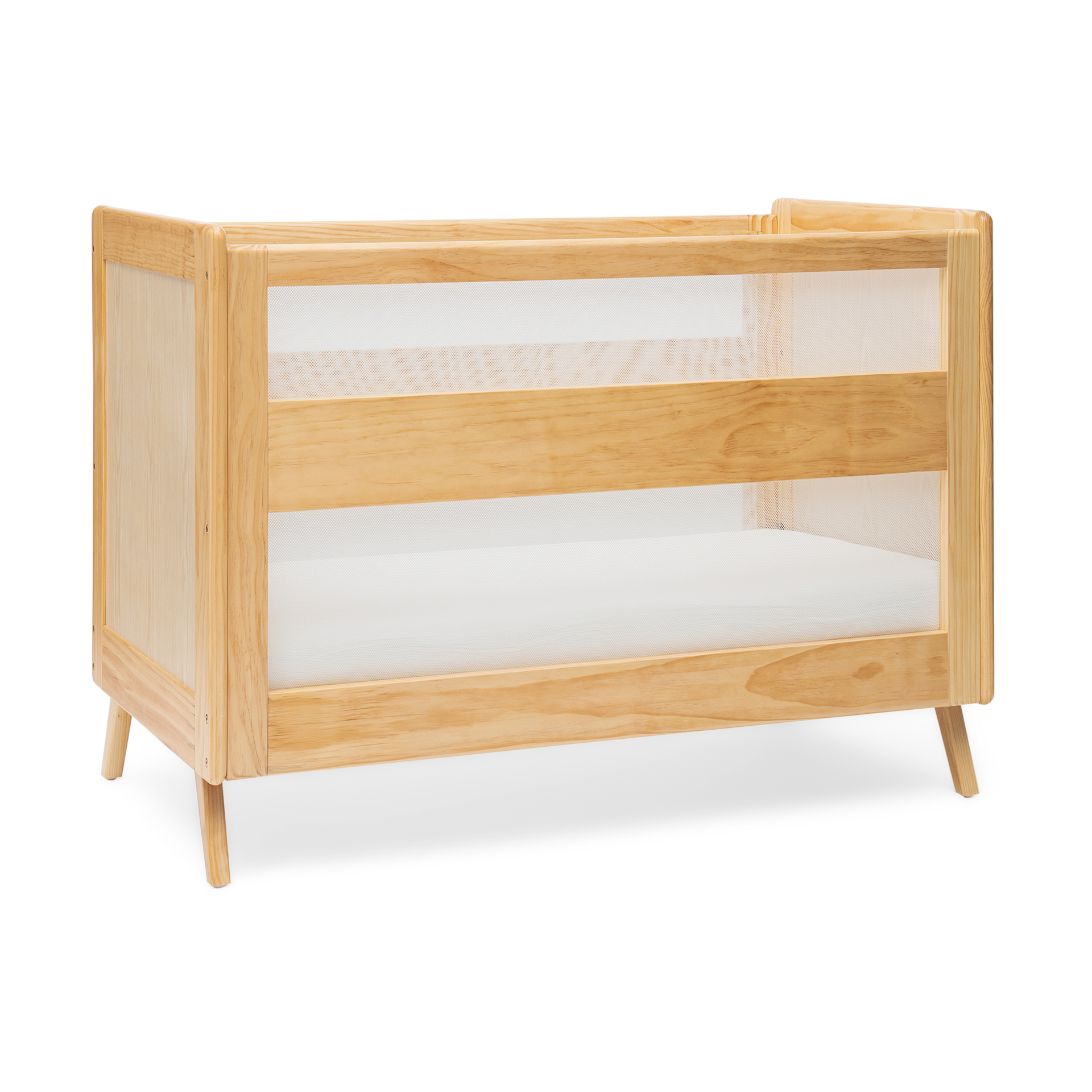 Crafted from New Zealand pinewood, the crib features mesh walls for breathability and visibility.