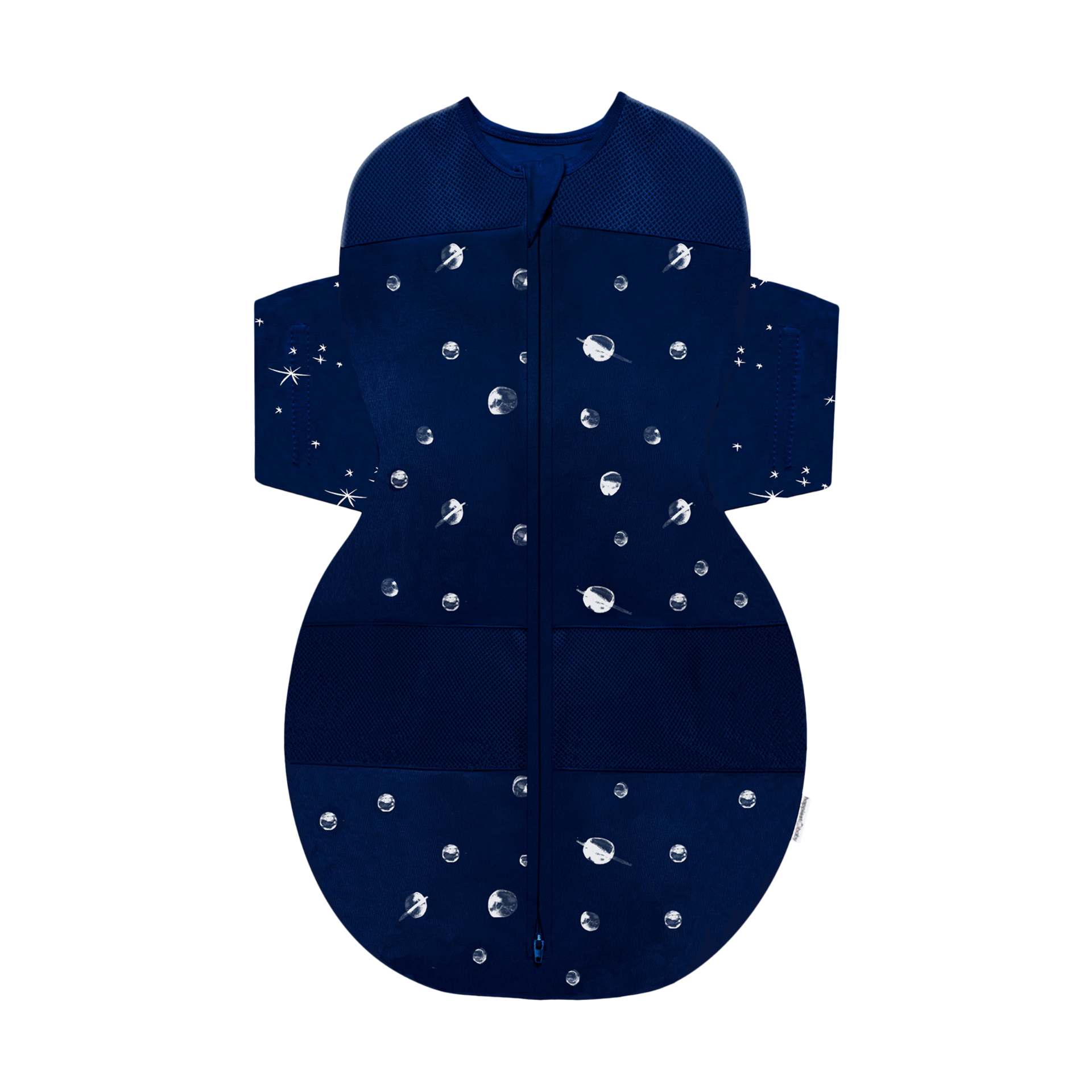 Designed to go on fast (SNOO calls it “the world’s first 5-second swaddle”), the Sleep Sack has a double zipper that allows you to zip from the top or bottom. The inner arm wrap and leg flap have extra-quiet secure Velcro while breathable mesh on the shoulders and waist help to reduce overheating. Arm openings can unsnap to allow for arms out (some babies prefer this), and the Sleep sack also promotes a healthier hip position.