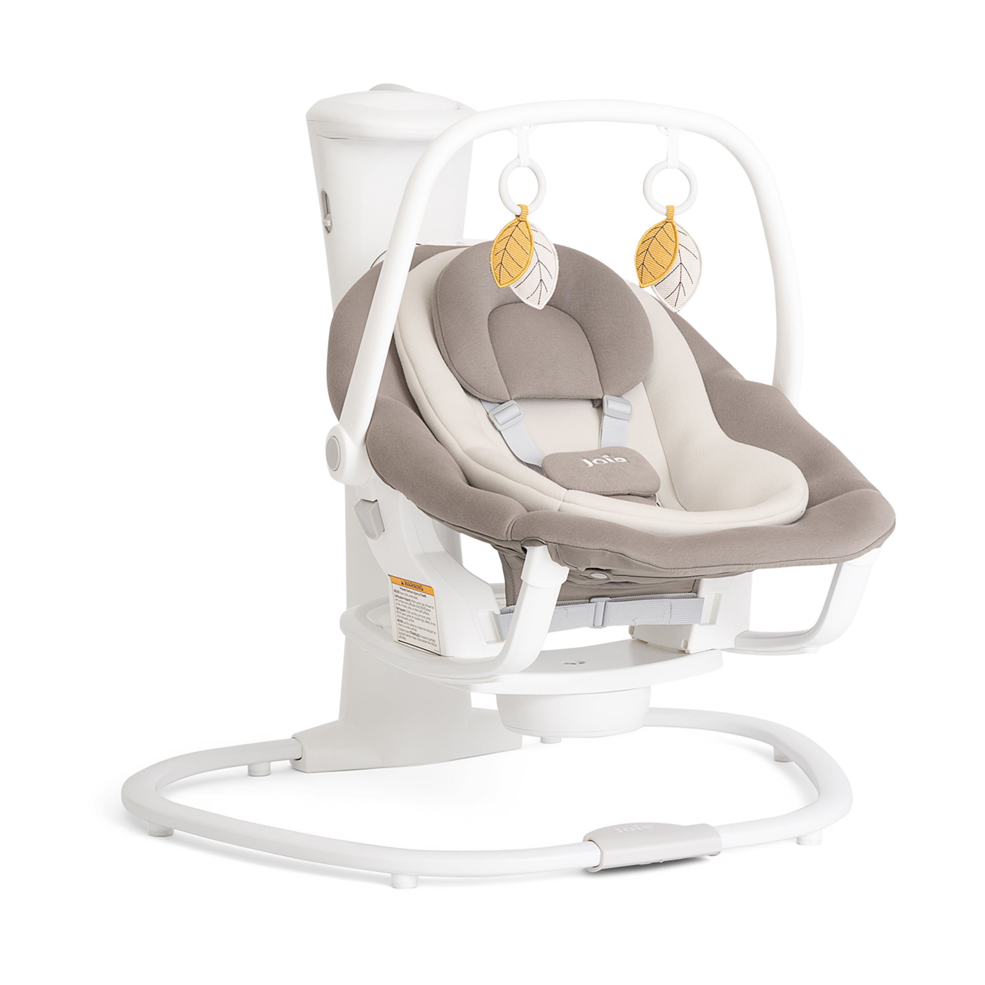 The swing comes with an engaging overhead toy bar (with two soft toys) that pivots out of the way when you’re lifting baby in and out of the seat.