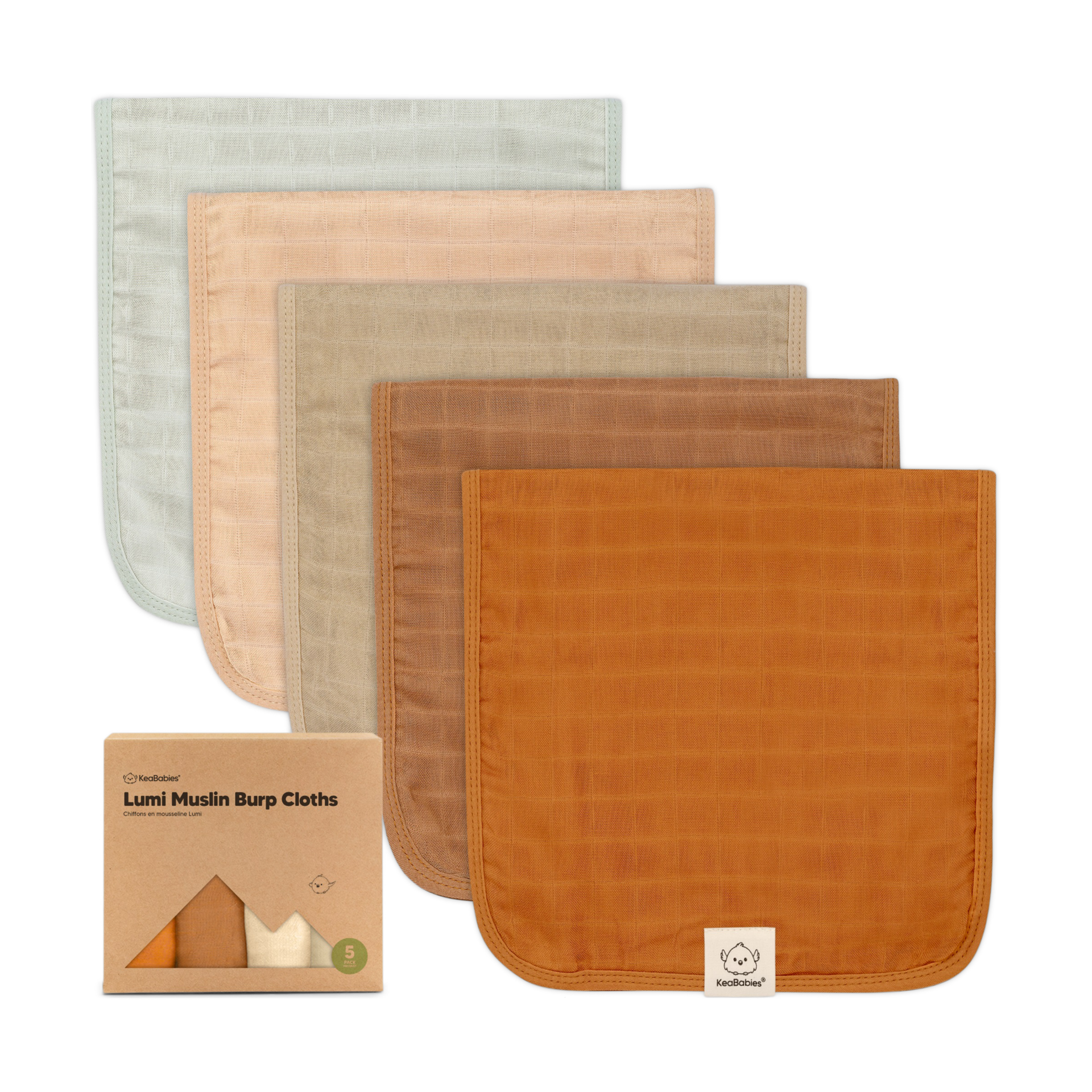Made with 8-layers of LumiSoft muslin, a proprietary organic bamboo cotton blend, KeaBabies Lumi Muslin Burp Cloths are silky-soft, absorbent and extra gentle for the most delicate cheeks. Lightweight and generously sized, these organic burp cloths provide non-slip full coverage over the shoulders.