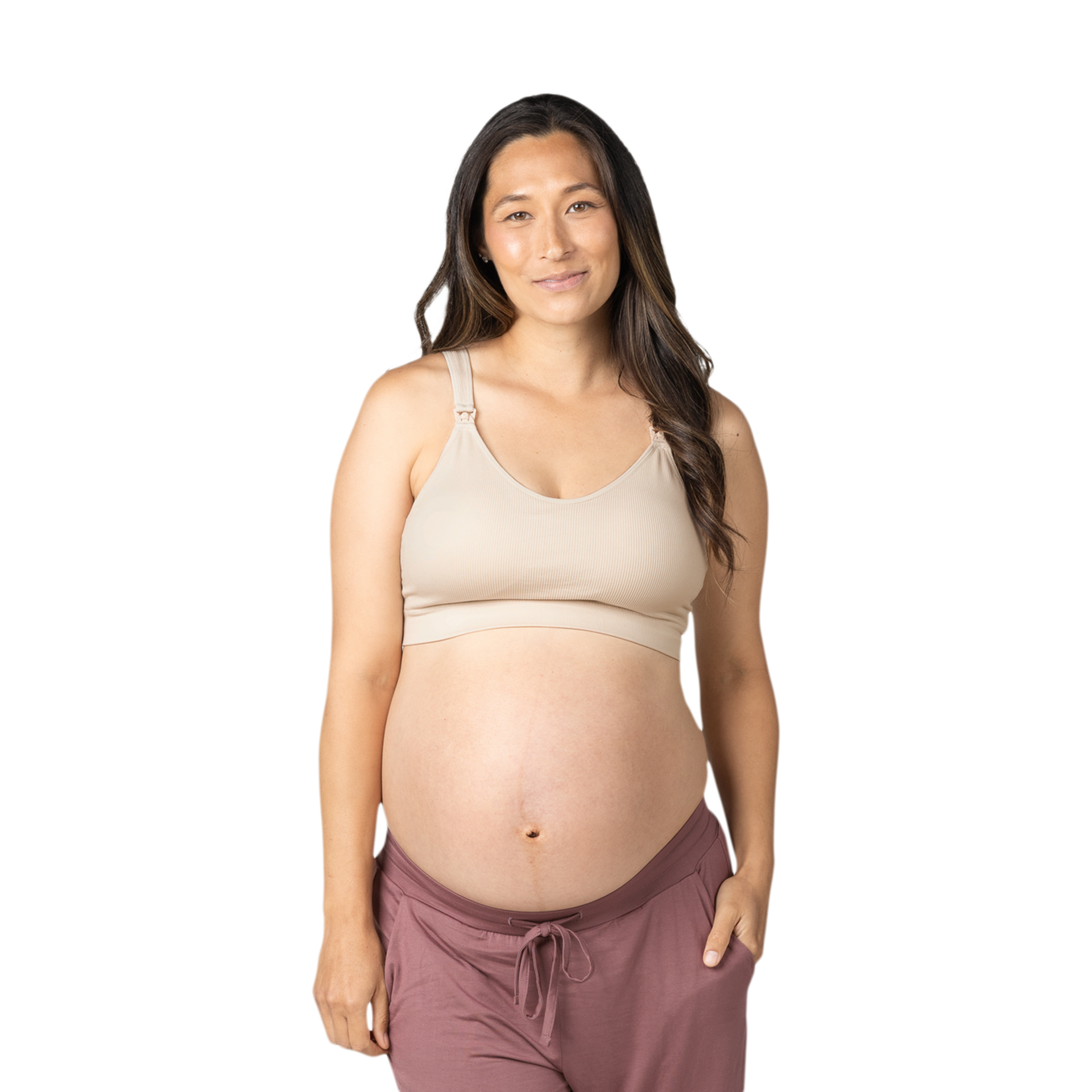 Designed with a combination of comfort and light support, this scoop-neck bra features soft, stretchy ribbed fabric with an easy pullover design and nursing clips. It accommodates breast size changes while the seamless construction ensures a smooth look.