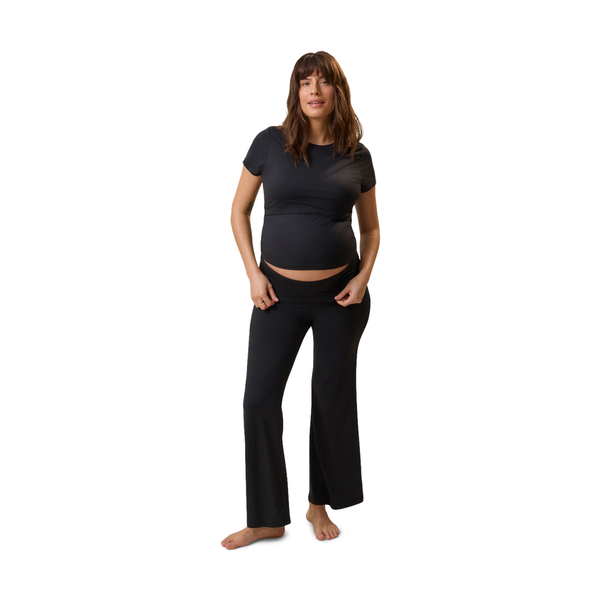 The flared pant is designed with a wide, foldover waistband that can be worn over or under your belly.