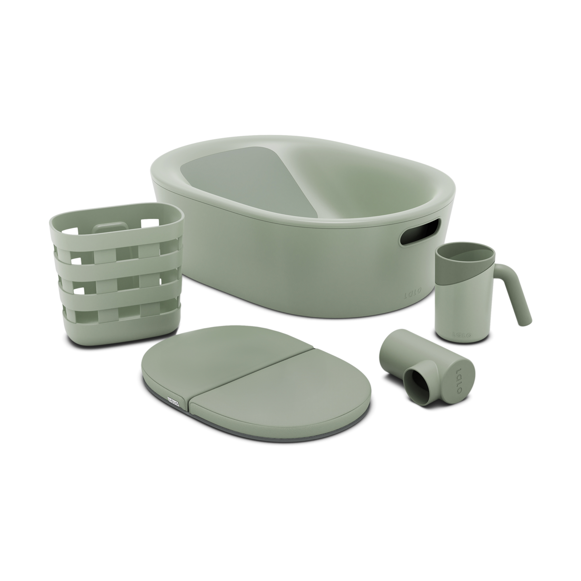 The Bathtime Full Kit from Lalo includes The Bath Tub and Knee Saver for caregiver comfort, plus bathtub accessories like the Bath Toy Bin to make cleaning and clean-up a breeze.