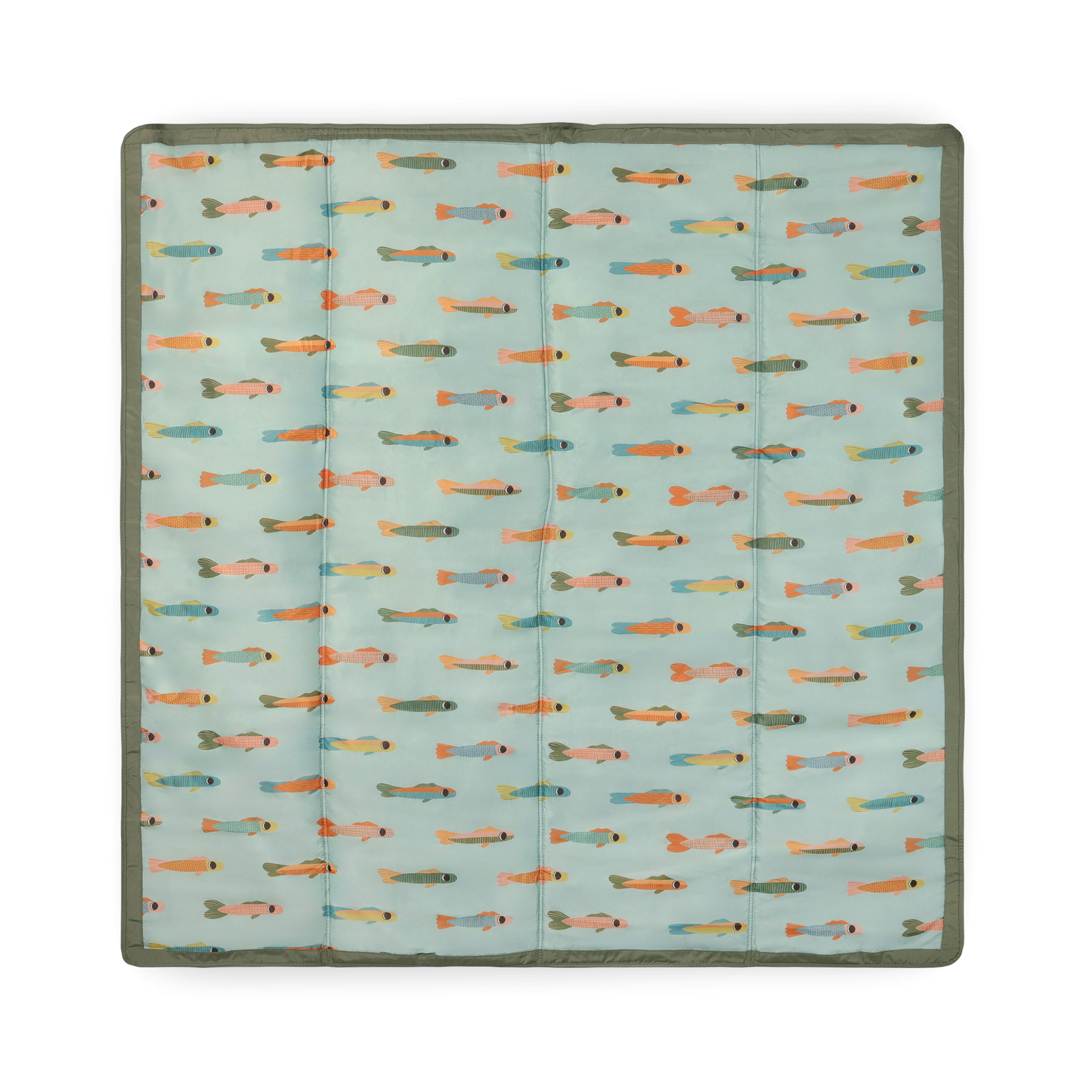 This one by Little Unicorn, with an easy-fold structure and a carrying handle is super simple to fold out and fold back up when the play is over. The blanket is two sided: the one that faces the ground is a durable, thick polyester that is water resistant and sturdy; the one that faces up toward you and baby is super soft (kind of like a sleeping bag). The soft side is water resistant as well, but not waterproof, so try to get to spills with a cloth if you can.