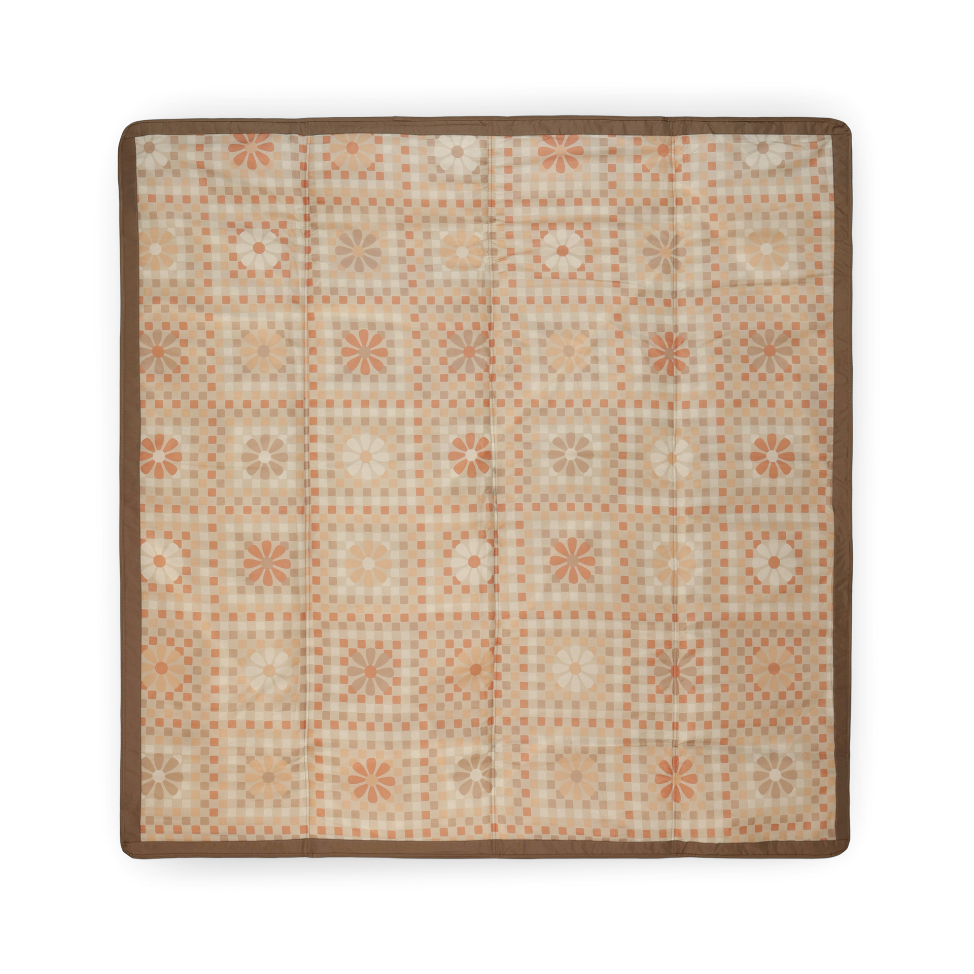 This one by Little Unicorn, with an easy-fold structure and a carrying handle is super simple to fold out and fold back up when the play is over. The blanket is two sided: the one that faces the ground is a durable, thick polyester that is water resistant and sturdy; the one that faces up toward you and baby is super soft (kind of like a sleeping bag). The soft side is water resistant as well, but not waterproof, so try to get to spills with a cloth if you can.