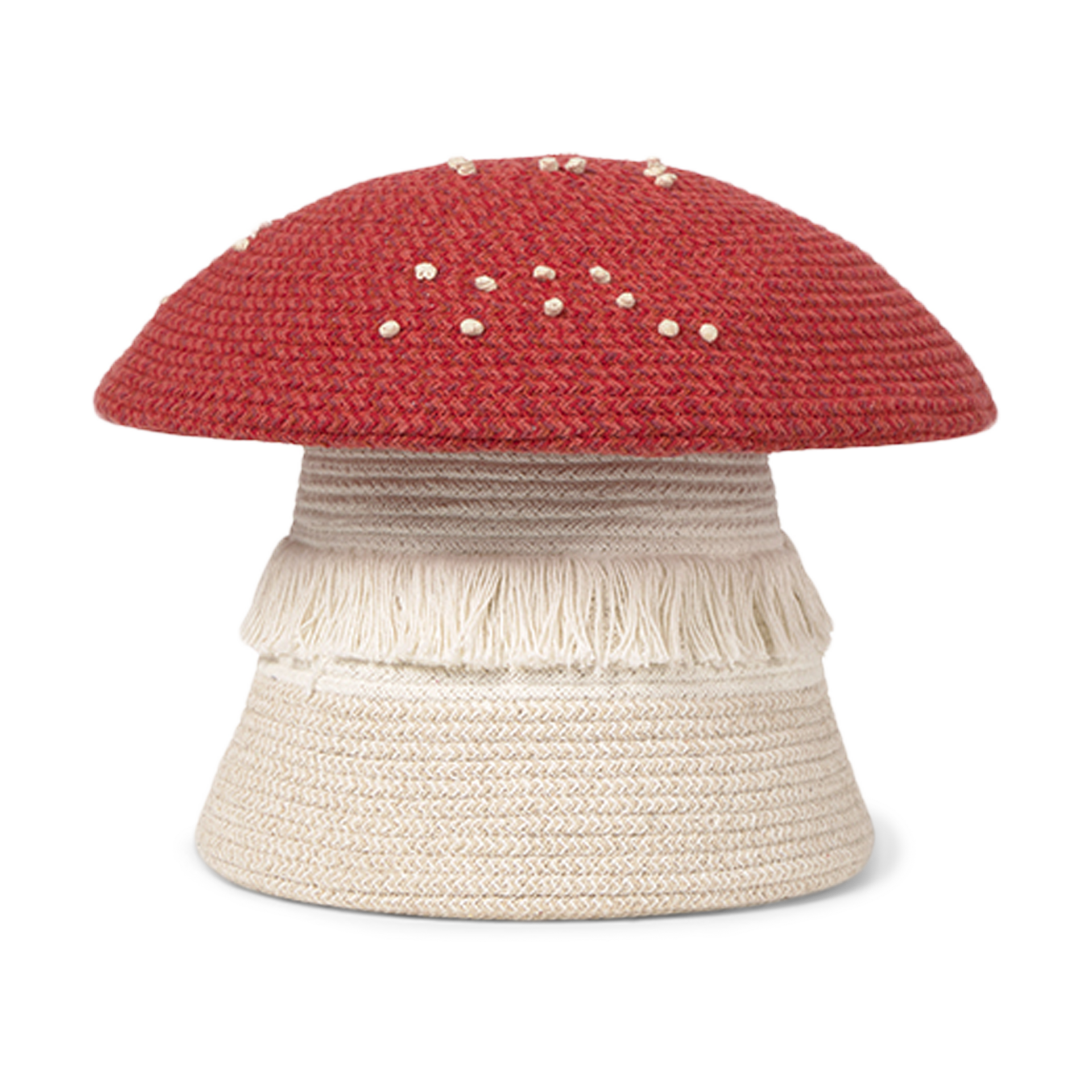 This charming handcrafted mini basket is full of detail, from the playful knots that mimic a mushroom’s white spots to the soft fringes on its trunk.