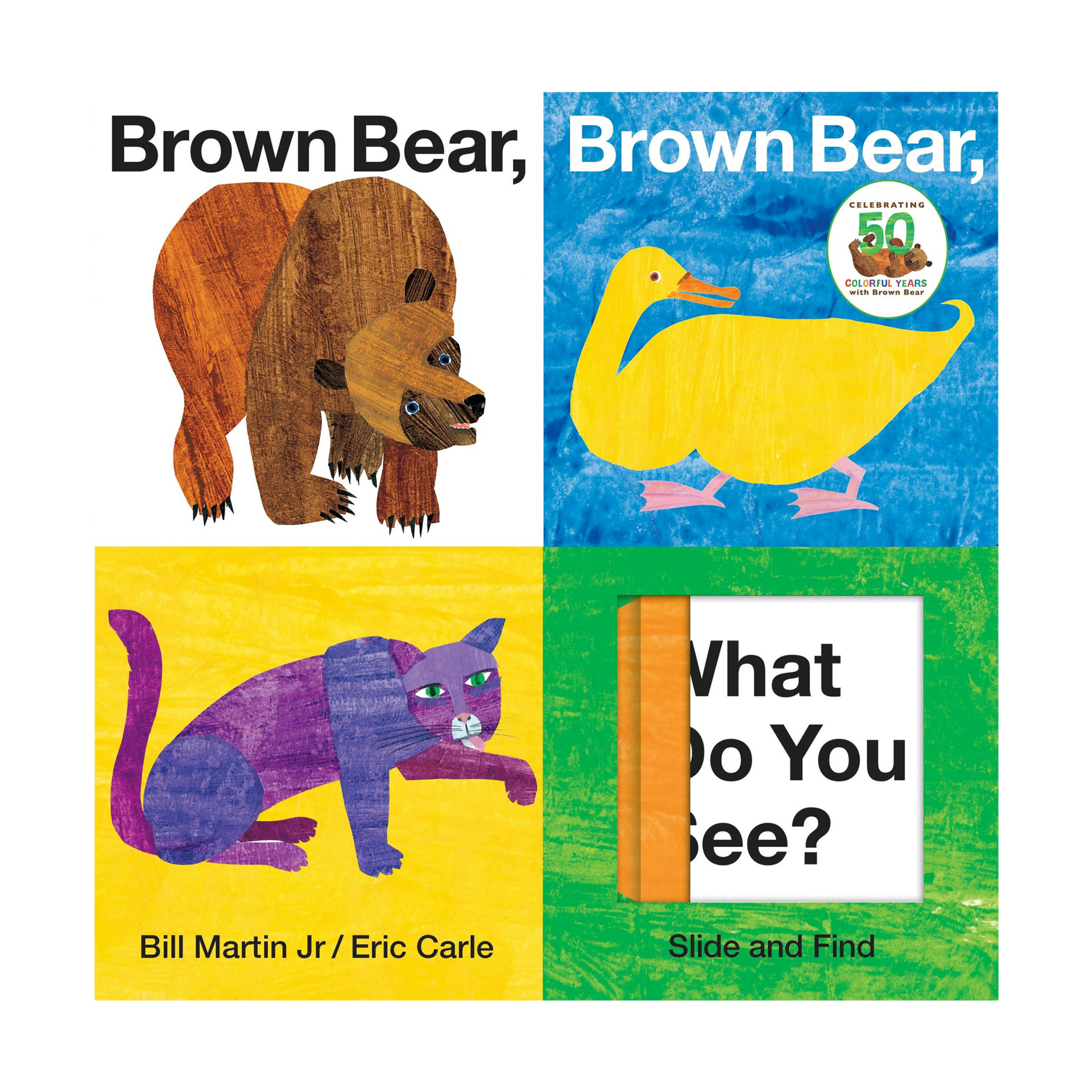 Eric Carle’s familiar illustrations of brown bear, red bird, yellow duck and the other endearing animals parade across the pages of this interactive Slide and Find board book.