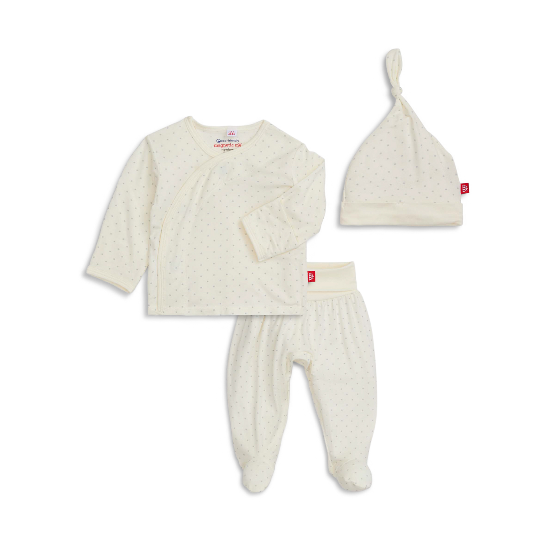 Magnetic Me’s take-me-home sets protect healing belly buttons and ensure easier changes. Smart Close magnetic closures help you get your baby all bundled up in just seconds, instead of fussing with snaps or zippers. Once you get the top one closed, the others practically close themselves. Built-in mitten cuffs also protect newborns from scratching themselves.