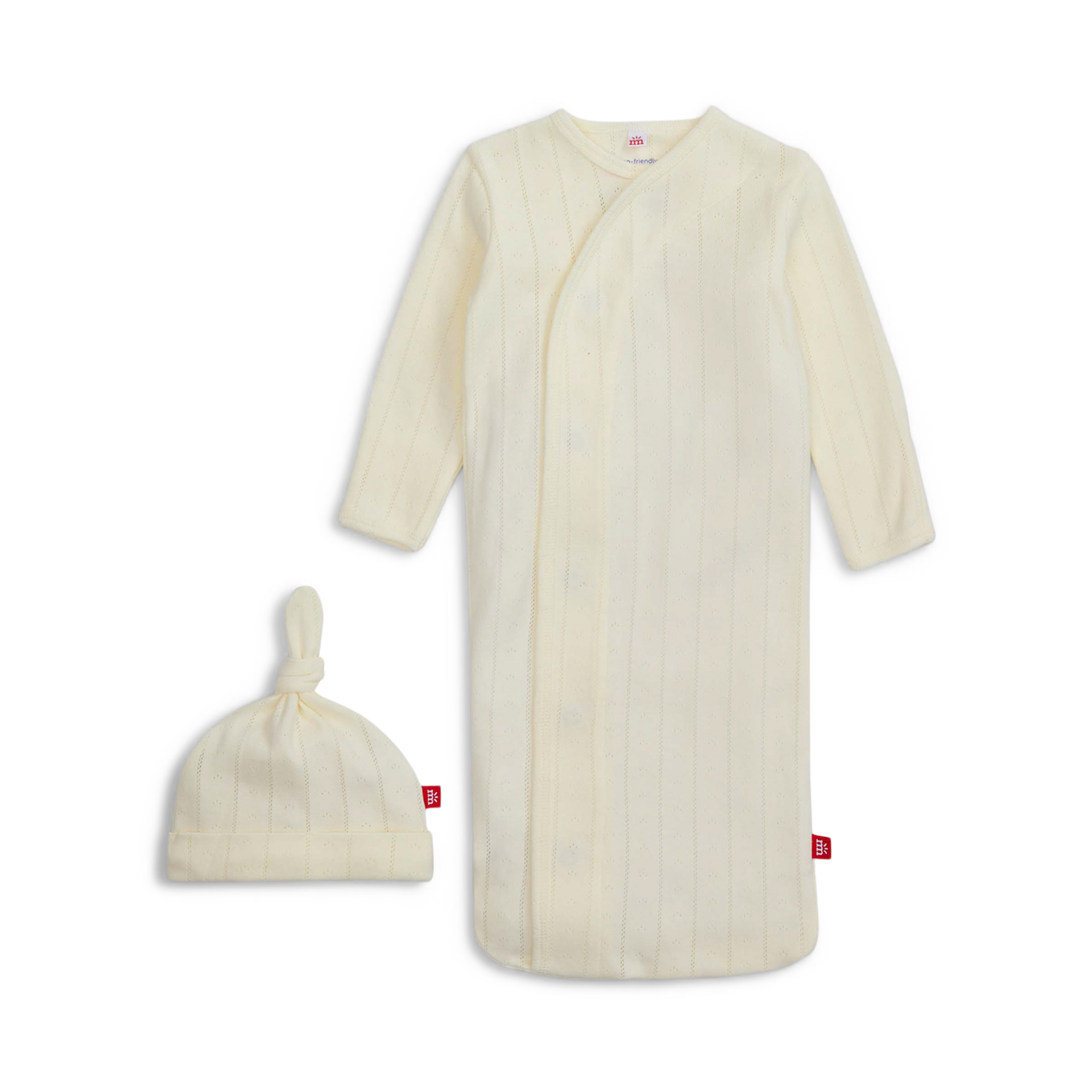 Made with soft organic cotton, this adorable gown and hat set is extra easy to get on and off. The gown has a no-over-the-head design, quick diaper access and hidden Smart Close magnetic closures that are seriously fuss-free.