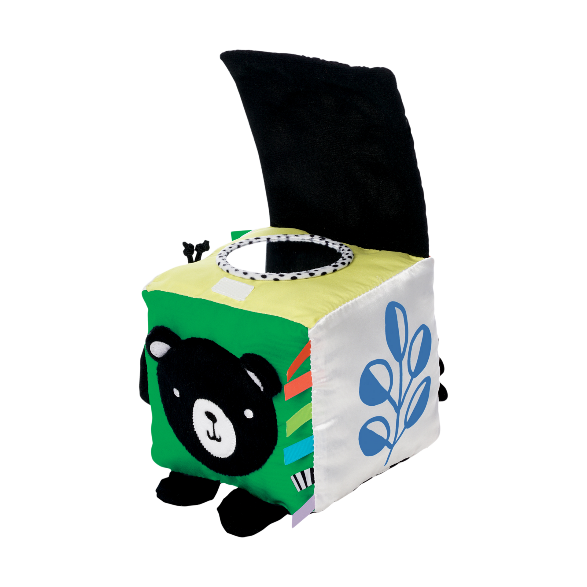 This six-sided discovery cube features sensory textures and peek-a-boo surprises on every side. Little ones love to explore the baby-safe mirror under the soft fabric flap, textured fabrics, colored ribbon and squishy-soft design.