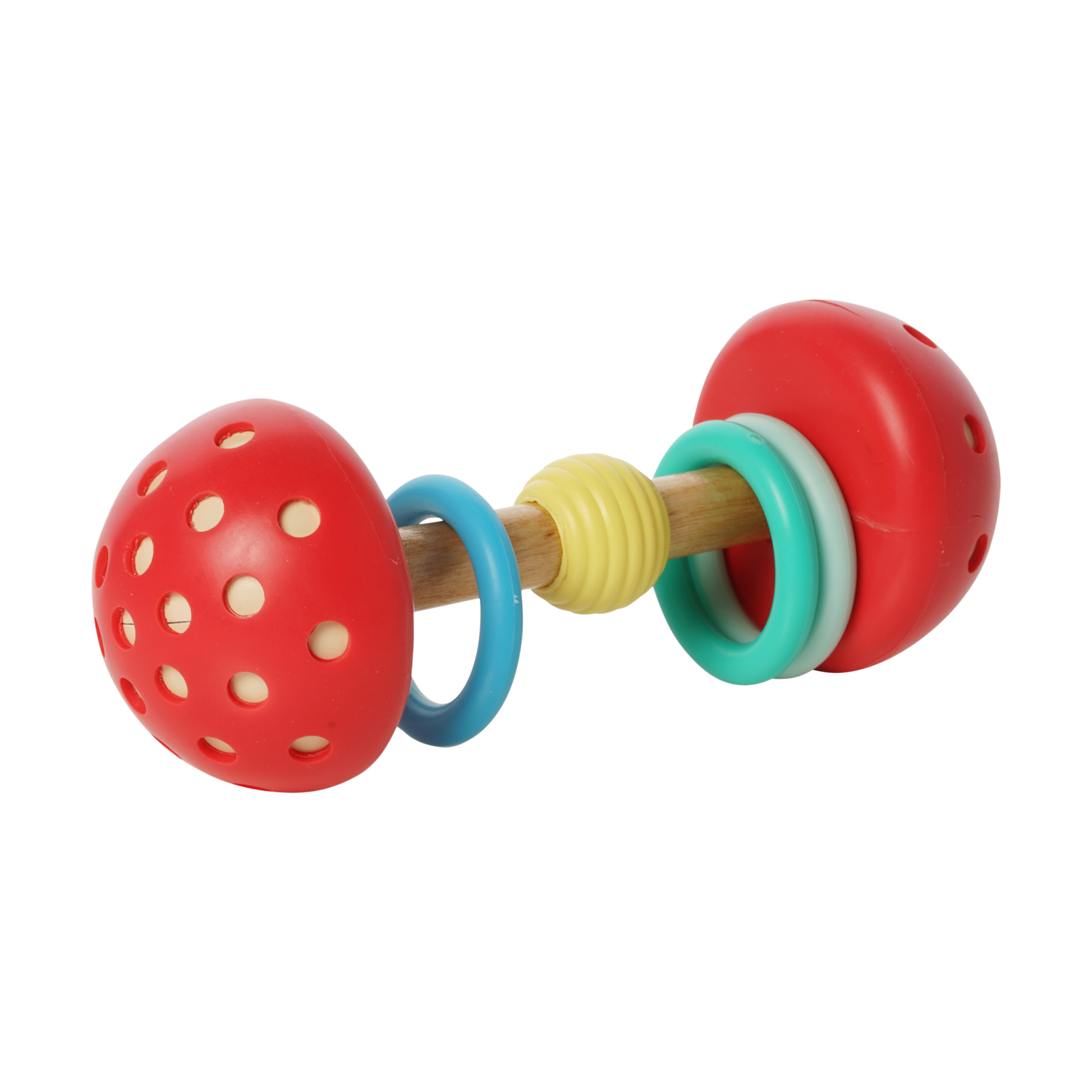 Toadstool Twist & Shake: This baby toy features a beech wood dowel rod with securely fastened toadstool-style plastic ends. The easy-to-hold multicolor bar-bell shaped toy keeps kiddos busy during their earliest years. The plastic teething rings, yellow textured bead and internal rattle encourage cause-and-effect learning while providing auditory and sensory stimulation.