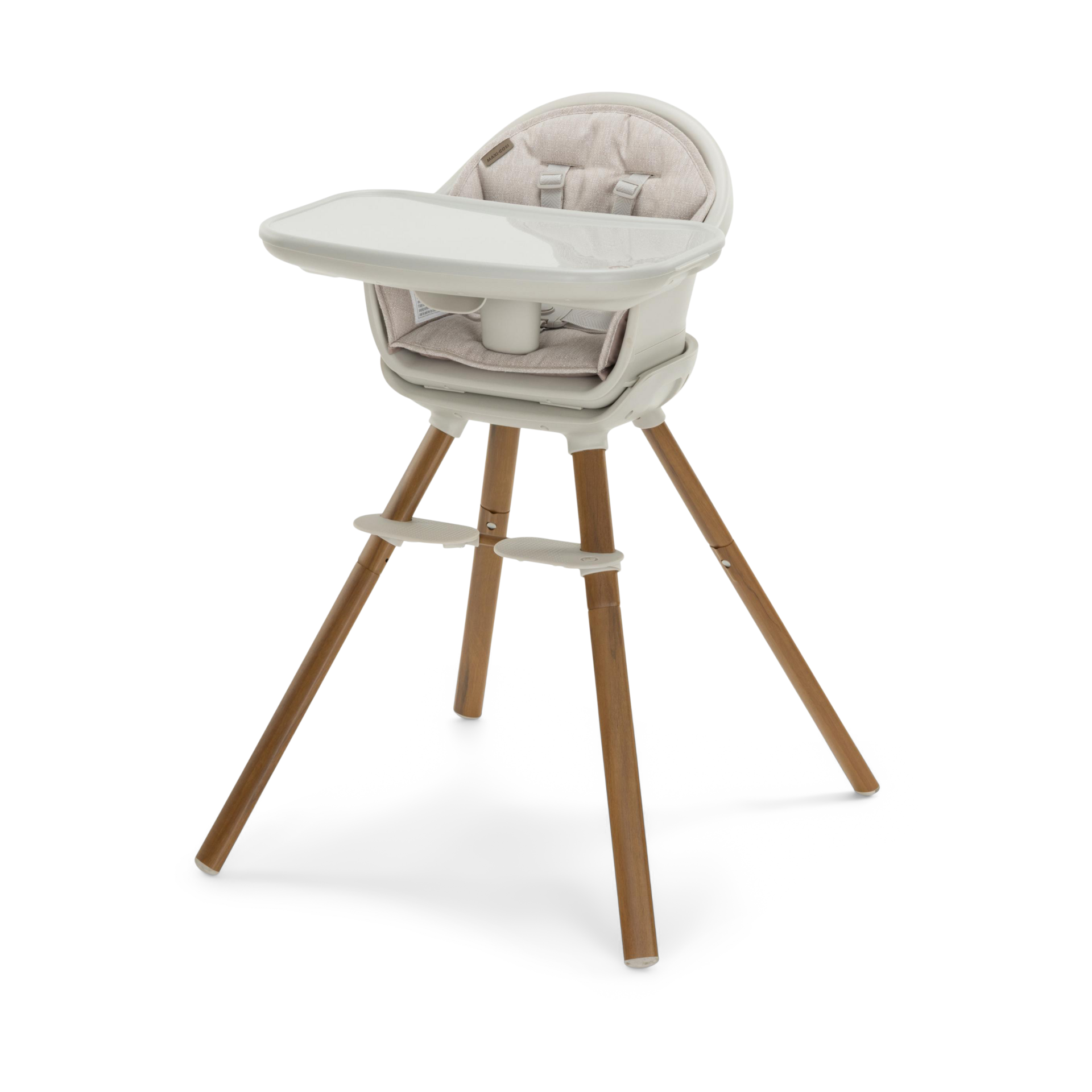 Designed for six months to five years, Moa reconfigures eight ways to extend the longevity of its use. As your little one develops, Moa adapts from an infant high chair to a toddler high chair, a booster seat, feeding booster, low stool, desk with stool, desk with chair and low-rise child chair with tray—perfect for your child to eat, discover, play and grow. It also has a three-level adjustable footrest.