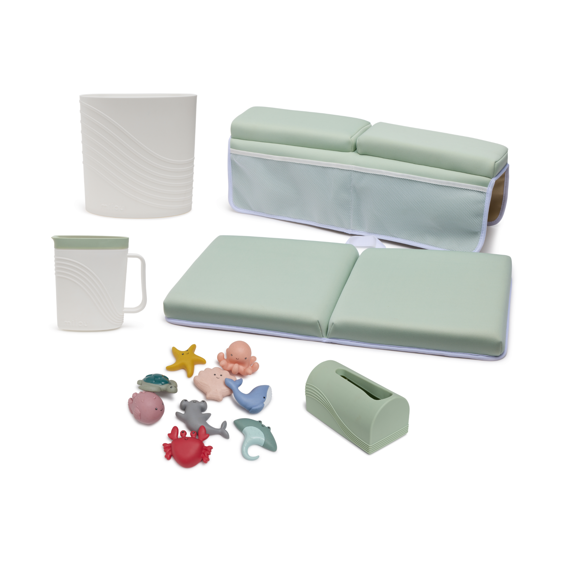 This Milou bathtime bundle comes with the Modern Elbow & Knee Rest, Modern Bath Rinse Cup, Modern Spout Cover, Modern Bath Toy Bin and Sea Creature Bath Toys, usually sold separately.