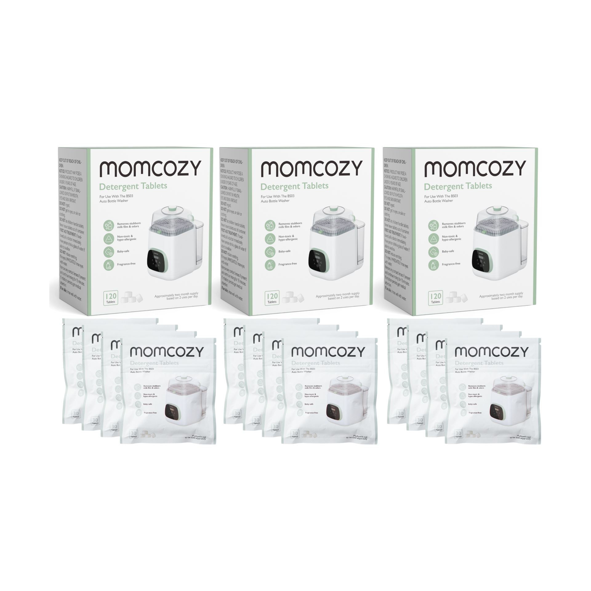 This is my third time purchasing these tablets for my Momcozy bottle washer. They work so well! There is never any residue leftover on the bottles/parts and they come out so clean and spotless. Highly recommend these tablets along with the bottle washer!!