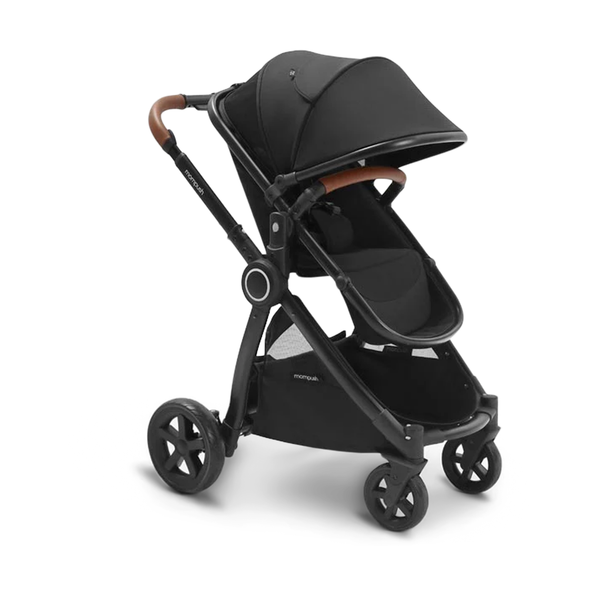 The telescoping faux leather stroller handle offers comfortable adjustment for caregivers. When it’s time to go home, the pram stroller folds in one step and stands independently, with or without the toddler seat attached.
