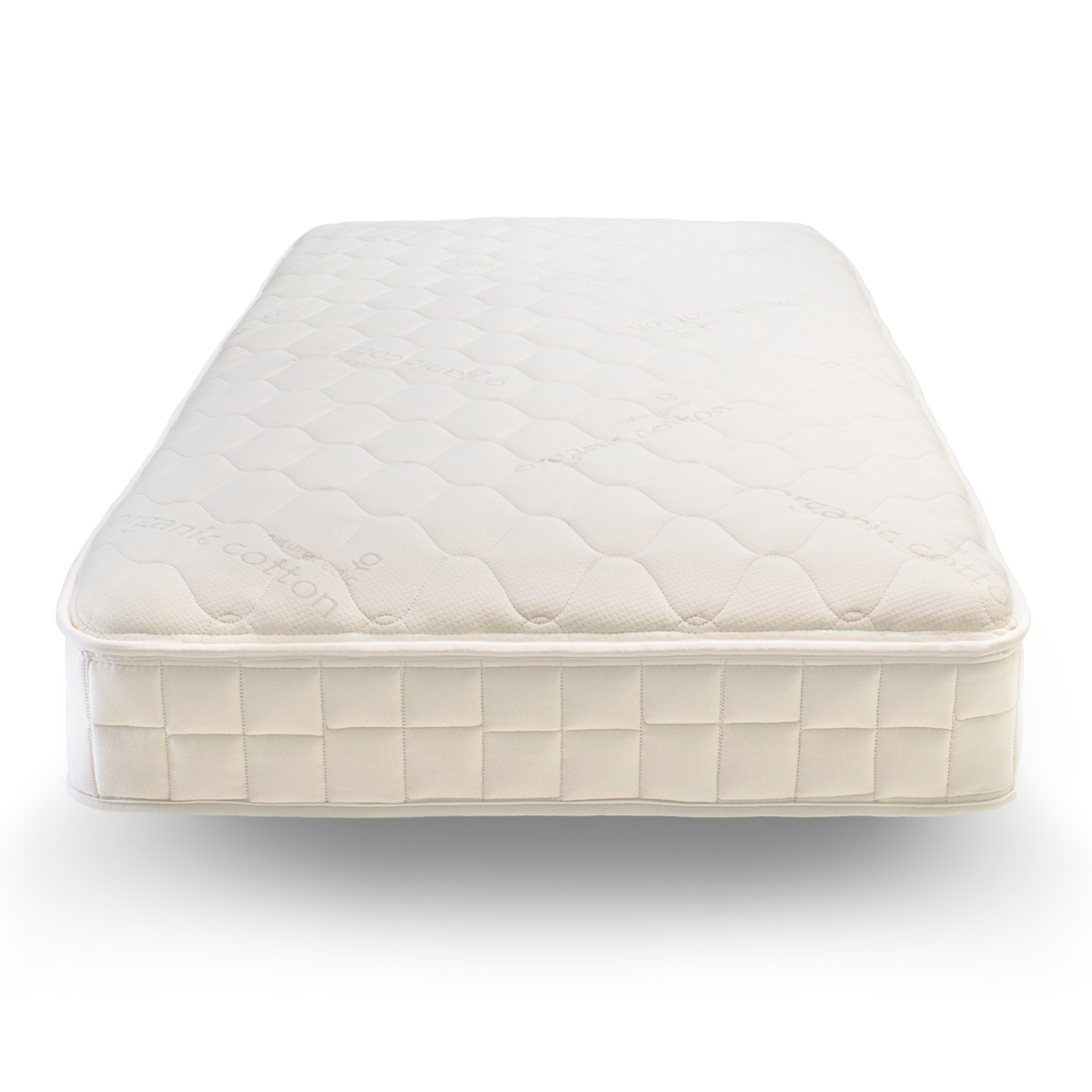 - Materials: Organic cotton fabric and fill, organic wool batting, PLA derived from non-GMO sugarcane comfort layer, glueless encased coils made with recycled steel