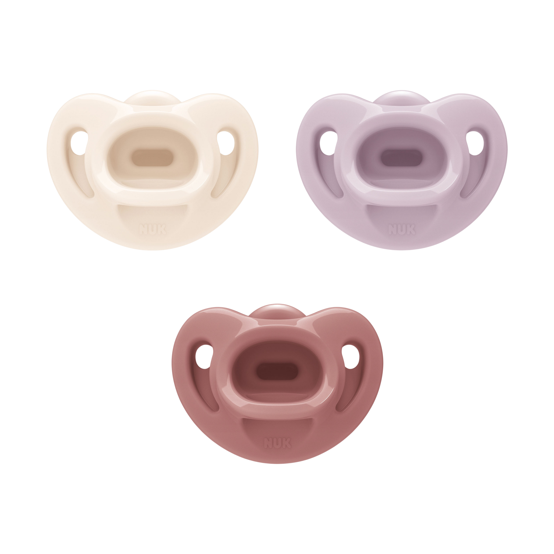 NUK Comfy Pacifiers feature a one-piece 100% silicone design that gently contours to baby’s face.