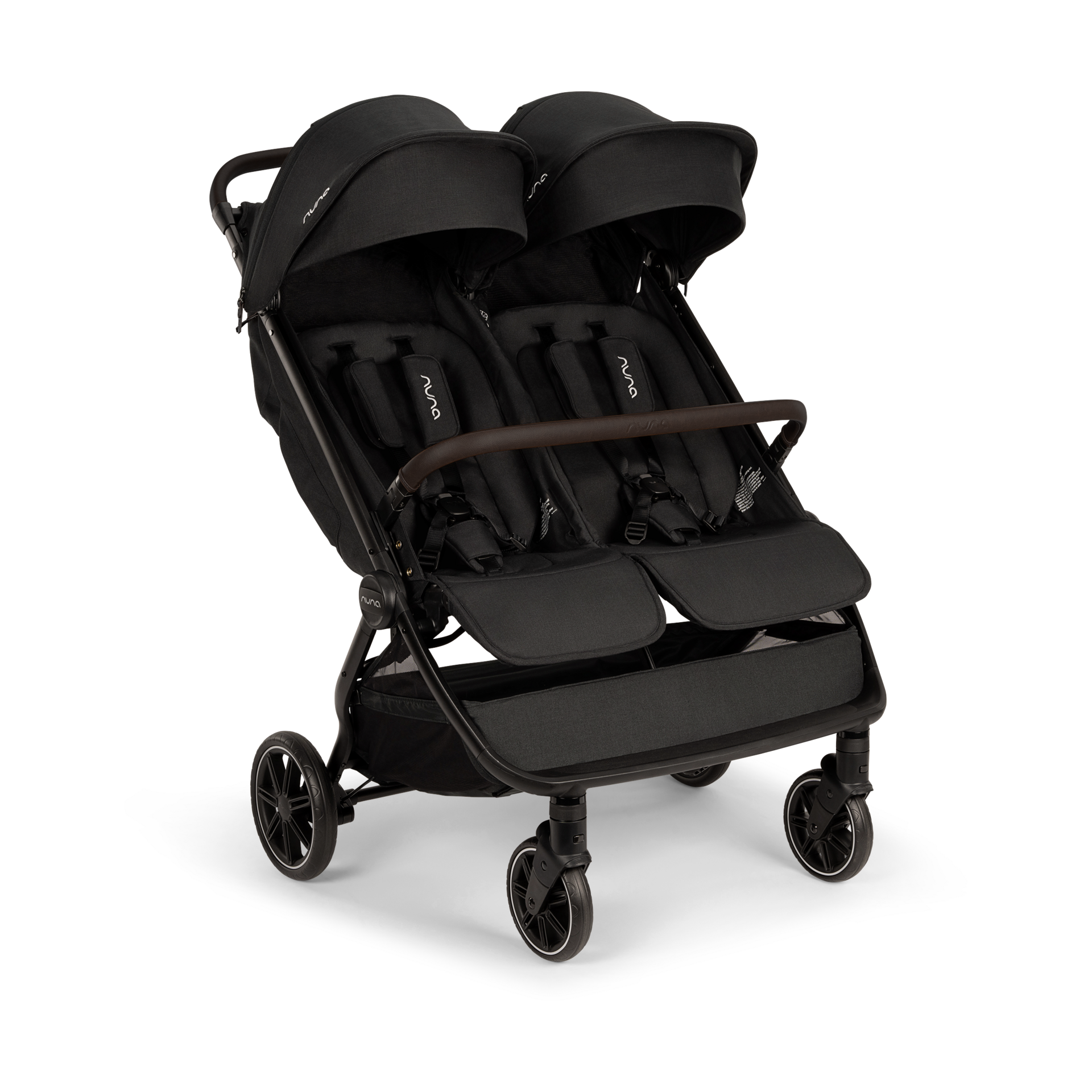 The TRVL dubl features premium details like a self-guiding MagneTech secure snap buckles that automatically lock into place, and a luxe leatherette-accented pushbar and removable armbar, which spans across both seats for quicker ins and outs. It’s easy to push and turn even with two, and front swivel wheels with locks allow for more comfortable strolls on uneven terrain.