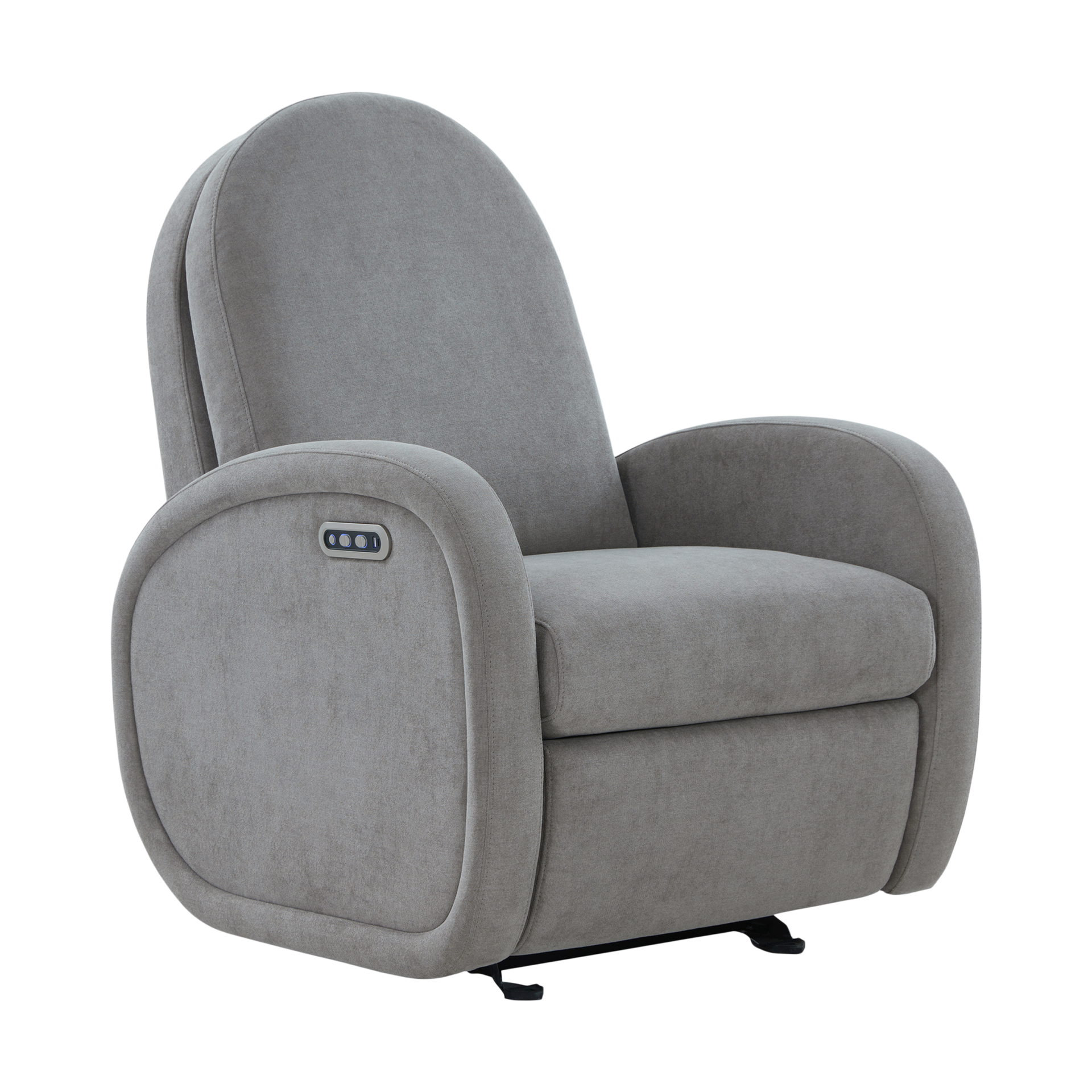 It features curved arms, a rounded silhouette, tall, supportive back and smooth power recline and glide