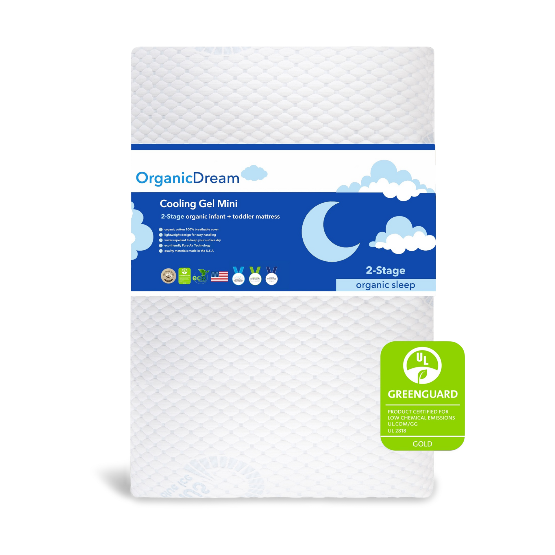 The Cooling Gel Premier 2-Stage Mini Crib Mattress is made from hypoallergenic organic cotton for comfort and premium support.