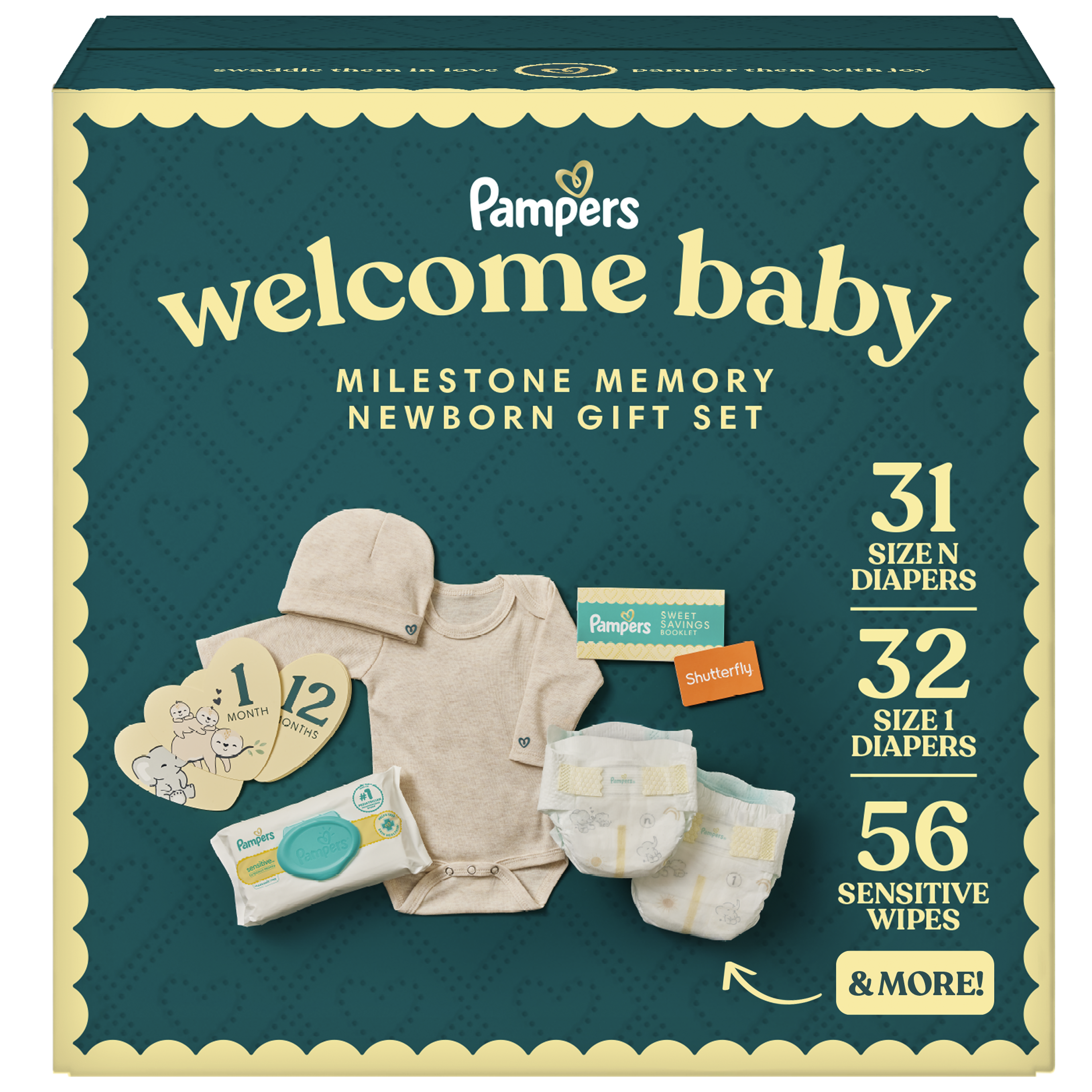 - THE PERFECT GIFT: Pampers Swaddlers Size Newborn and Size 1 diapers, Pampers Sensitive Wipes, Milestone Marker Cards, Onesie and Hat, Coupons, and a Shutterfly gift.