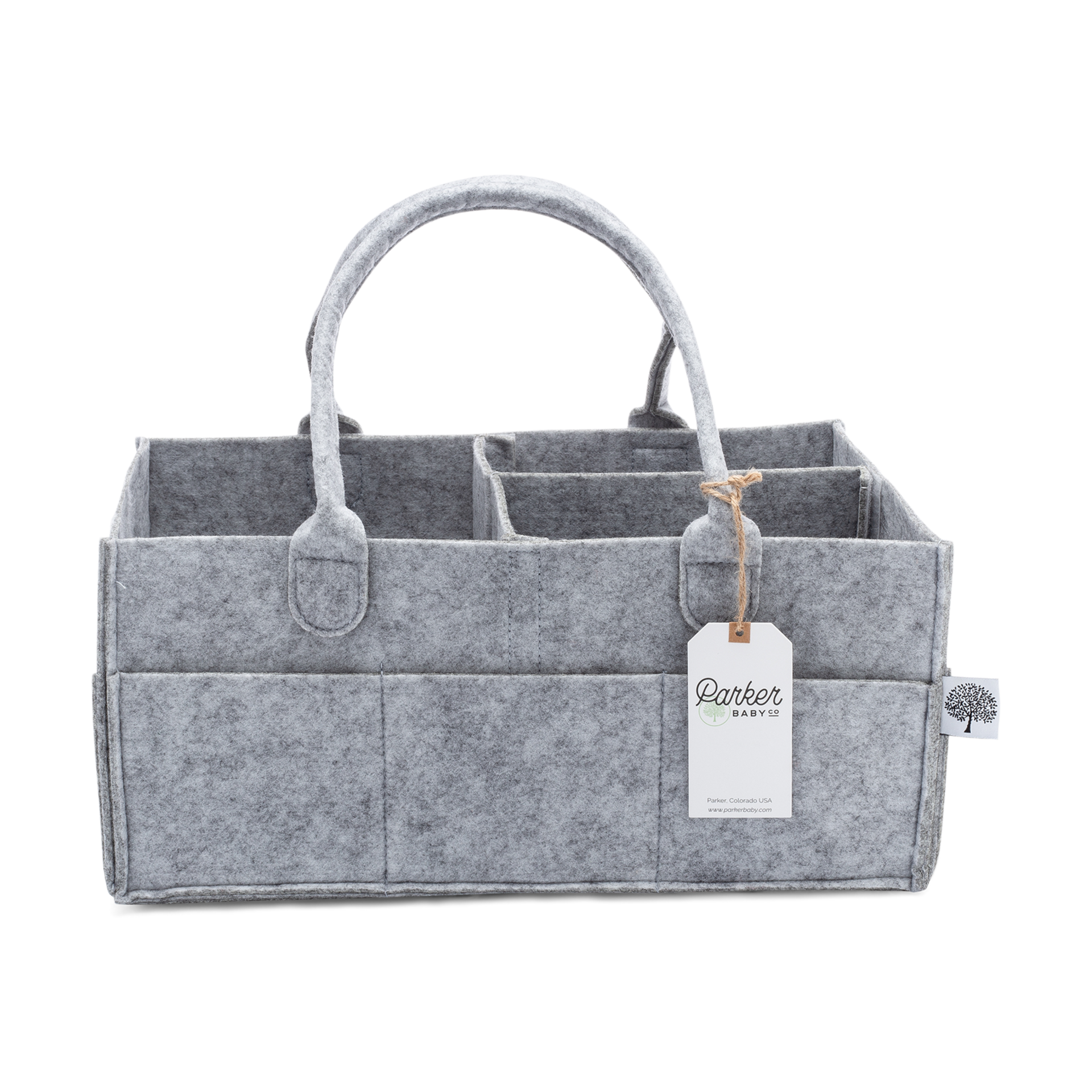 Made of durable felt, Parker Baby’s Diaper Caddy features three compartments with a removable insert and eight exterior pockets for plenty of versatility. The hand-cut edges have a clean finish and cool look.