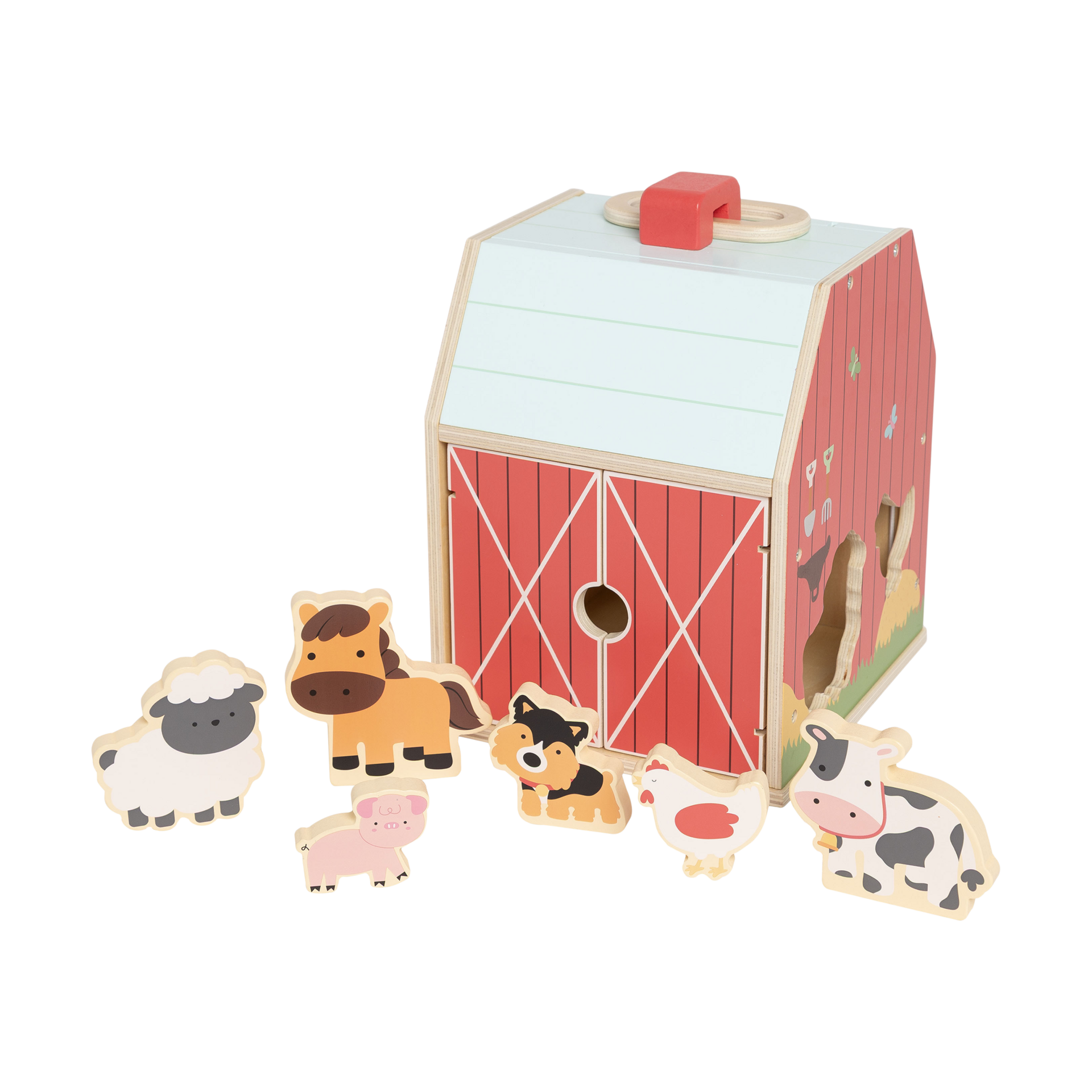 _ Age: 2 years+ - 7.25”W x 10”H x 7.88”D - Includes: - 1 wooden barn with flip-up roof and handle - 6 wooden animals (cow, horse, pig, sheep, chicken, dog) - FSC-certified wood